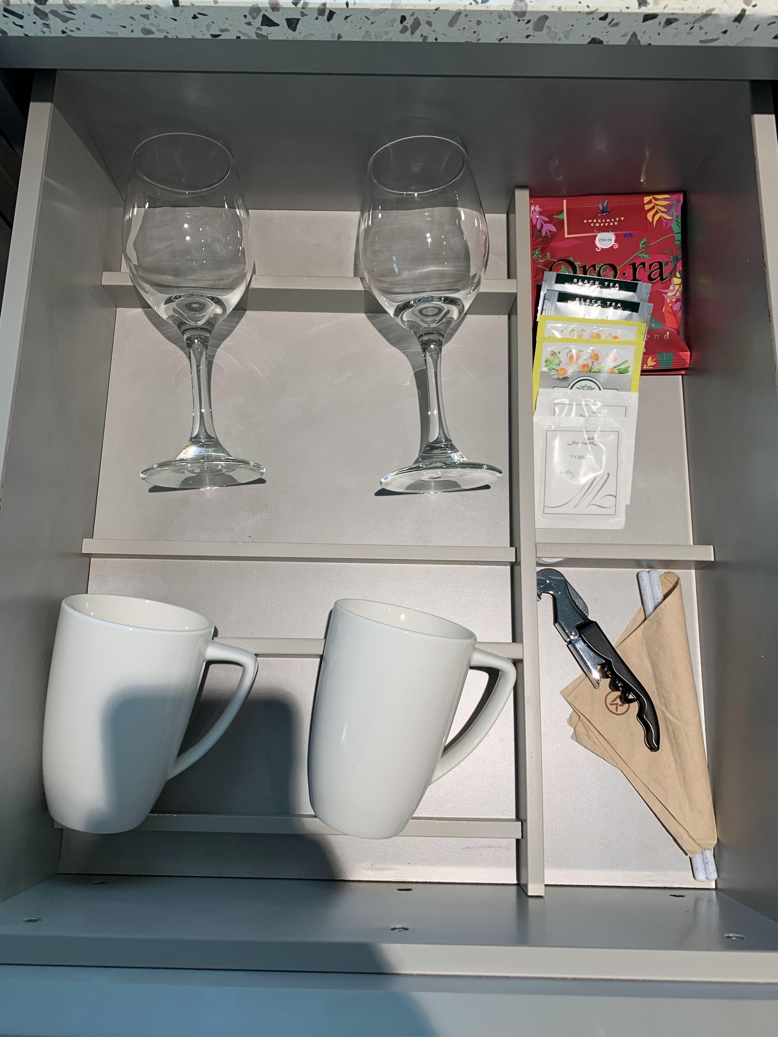 맥가이버 나이프와 컵, 스트로우, 티가 2세트씩 준비되어 있다.