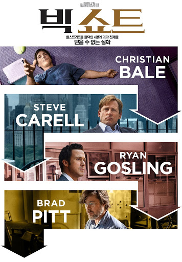영화 빅 쇼트는 서브프라임 모기지론으로 일순간에 무너진 미국 주식 시장에 관한 이야기입니다. 주택 시장에서 발생한 대출 관련 위험 요소들과 금융 기관들의 부실화로 한 순간에 경제 하락이 이루어진 사건입니다. 서브프라임 모기지론은 신용도가 낮은 개인에게 대출을 해주는 시장입니다. 이들에게 주택 대출을 제공하는 금융 기관들은 높은 이율과 수수료를 부과하여 리스크를 상쇄하려 했습니다. 주택 시장의 호황으로 초기에는 수익성이 있었으나 기관들은 이 대출을 주택 담보로 증권화하여 투자자들에게 판매하였습니다. 대출을 받은 개인들이 대출금을 상환하지 못하였고 주택 시장이 하락하며 곧 이어 증권들의 가치가 하락 하였습니다. 이후 금융 시장은 큰 충격을 받았고 엄청난 경제적 위기에 처했습니다. 영화의 주된 이야기는 이와 같은 배경에서 흘러갑니다.