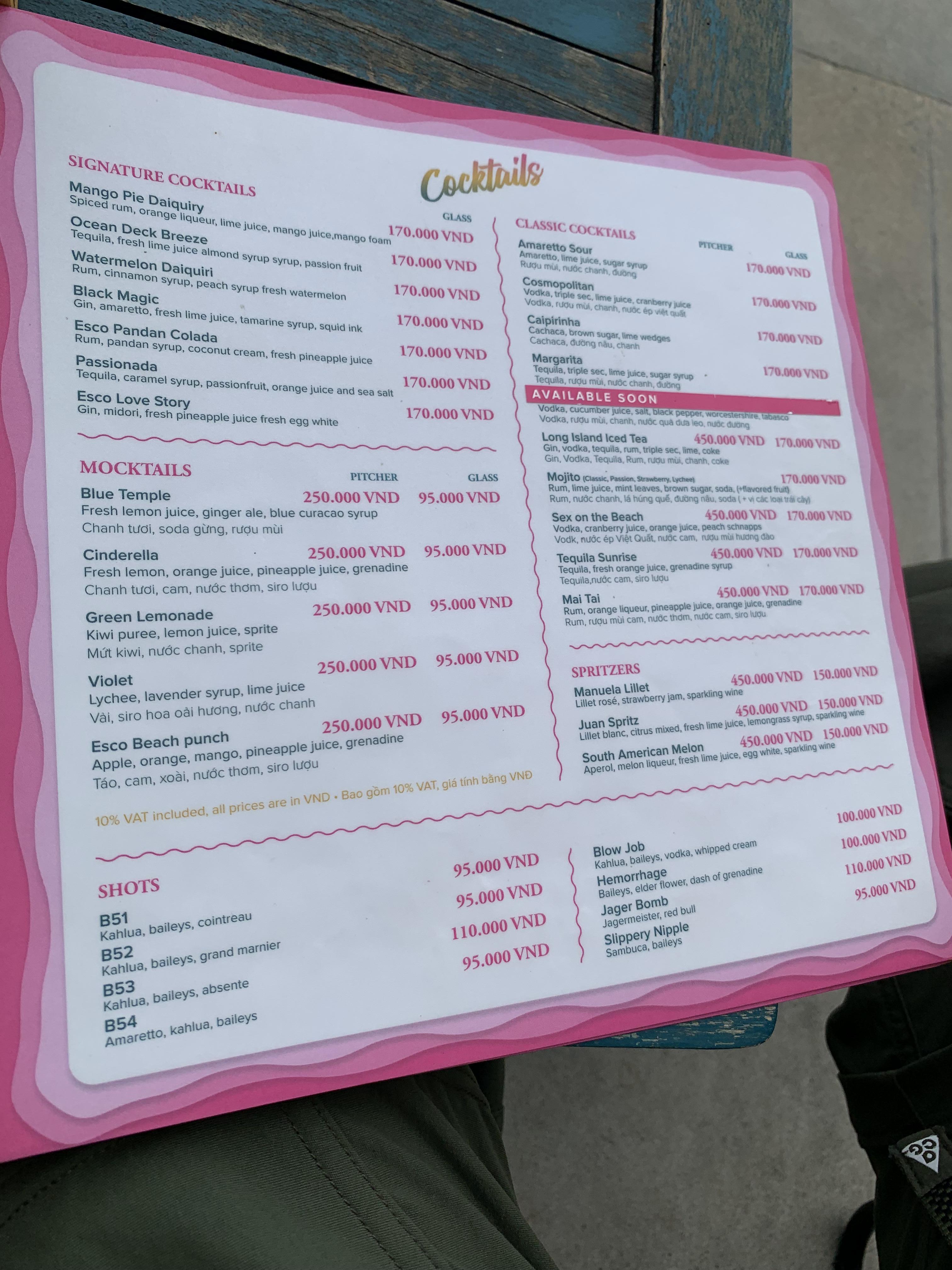 에스코 비치바의 메뉴이다.