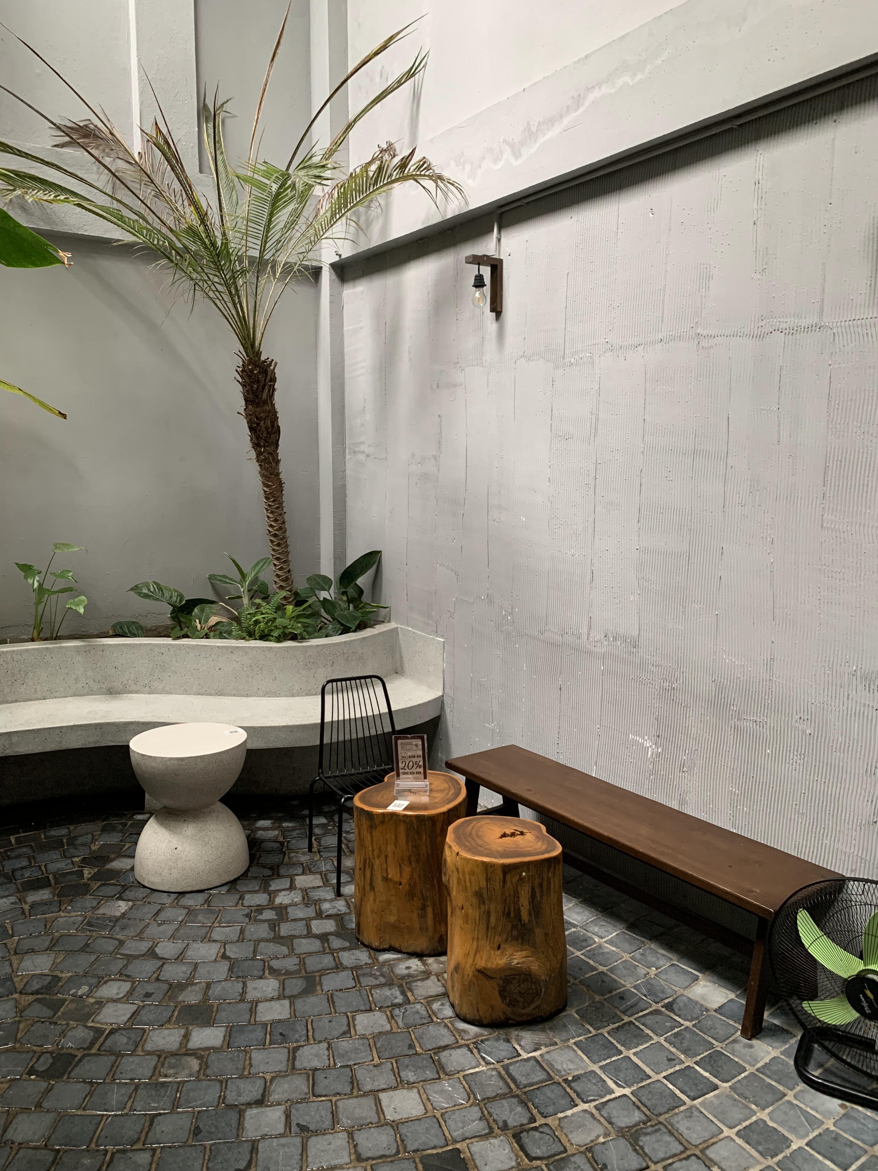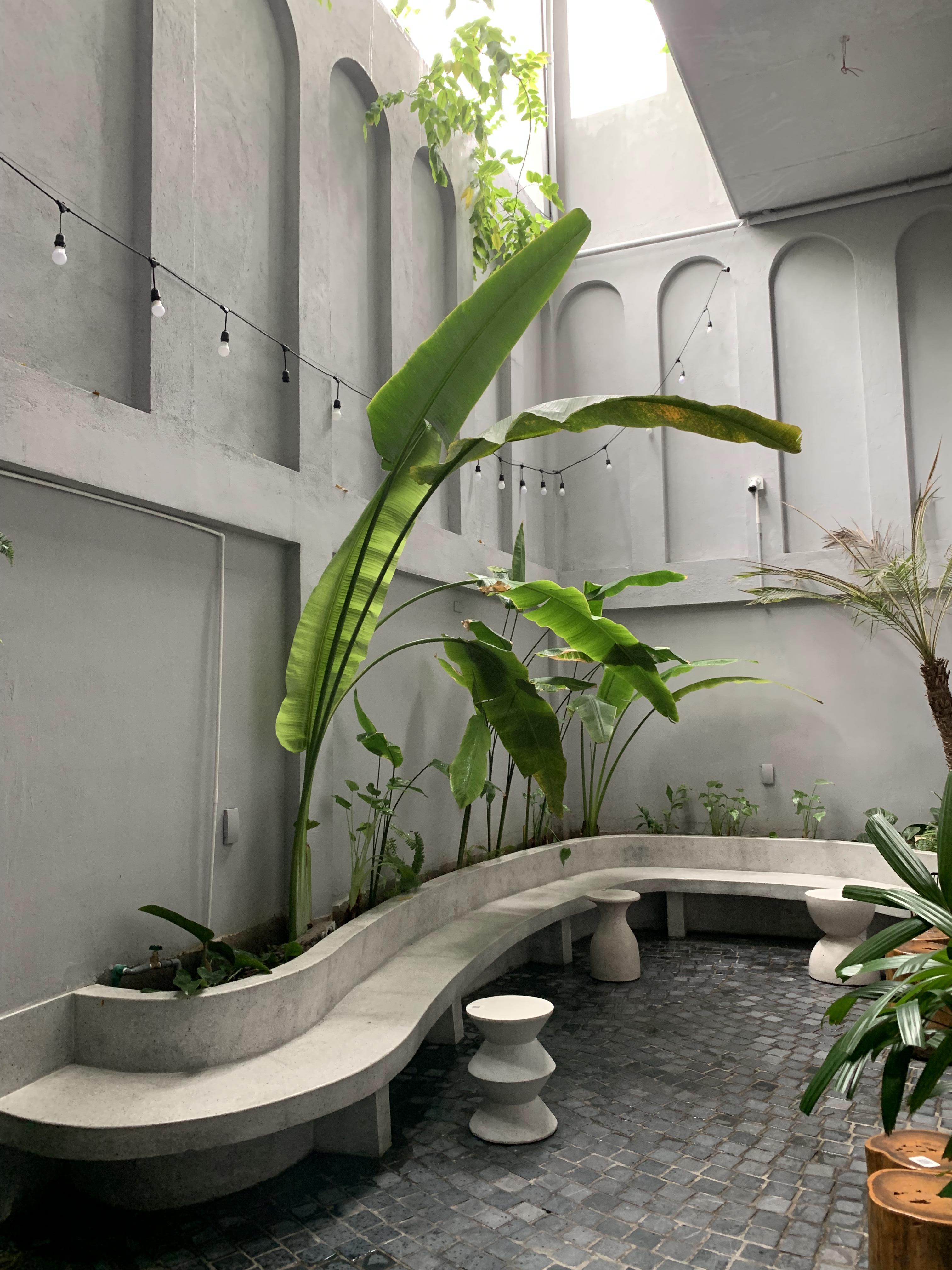 1층 중정에는 석재 의자가 있었다. 건물의 벽채와 비슷한 색상으로 매치하고 조금 차가워 보일 수도 있는 요소들을 식물로 중화시키려 한 듯 보였다.