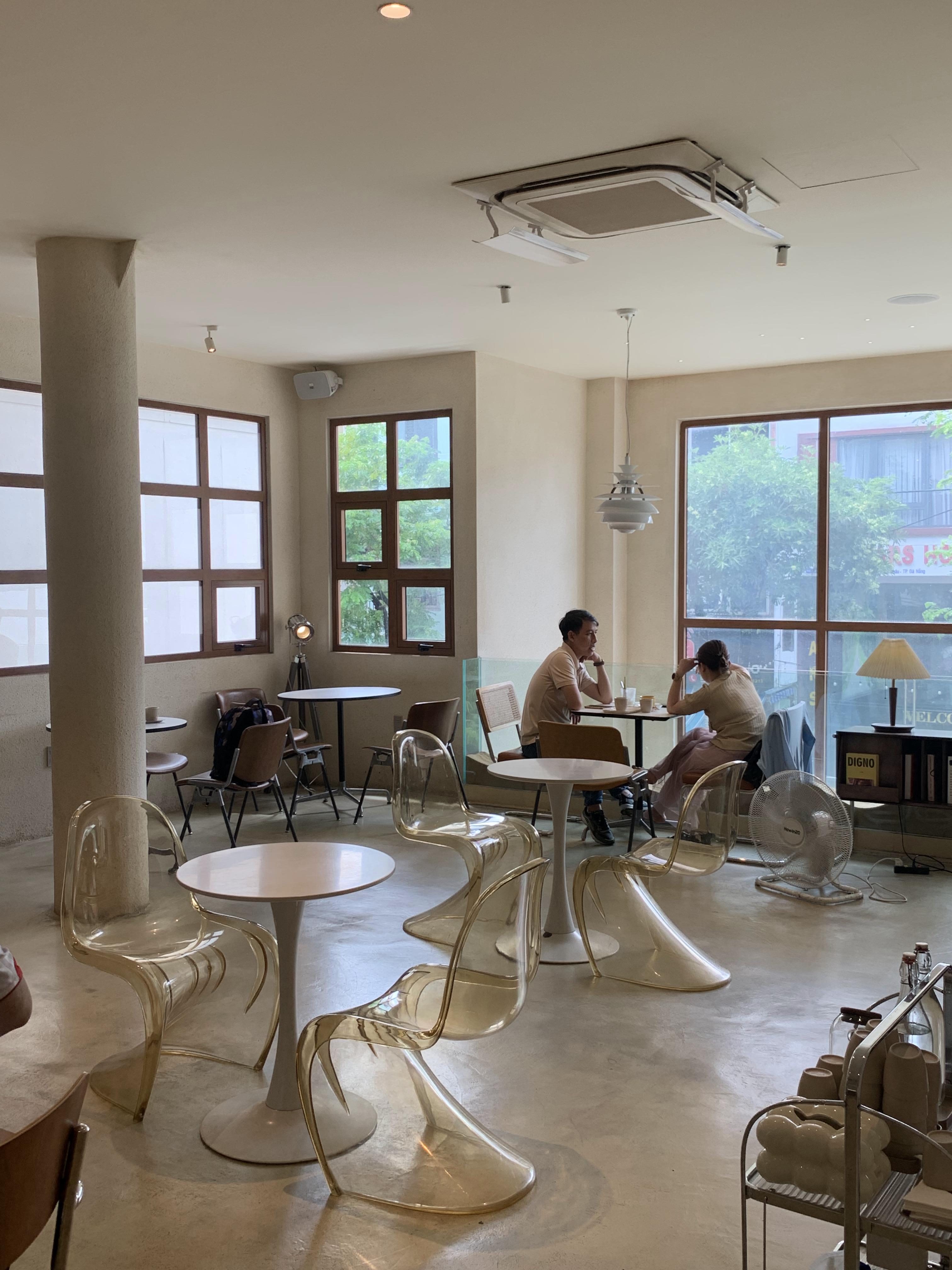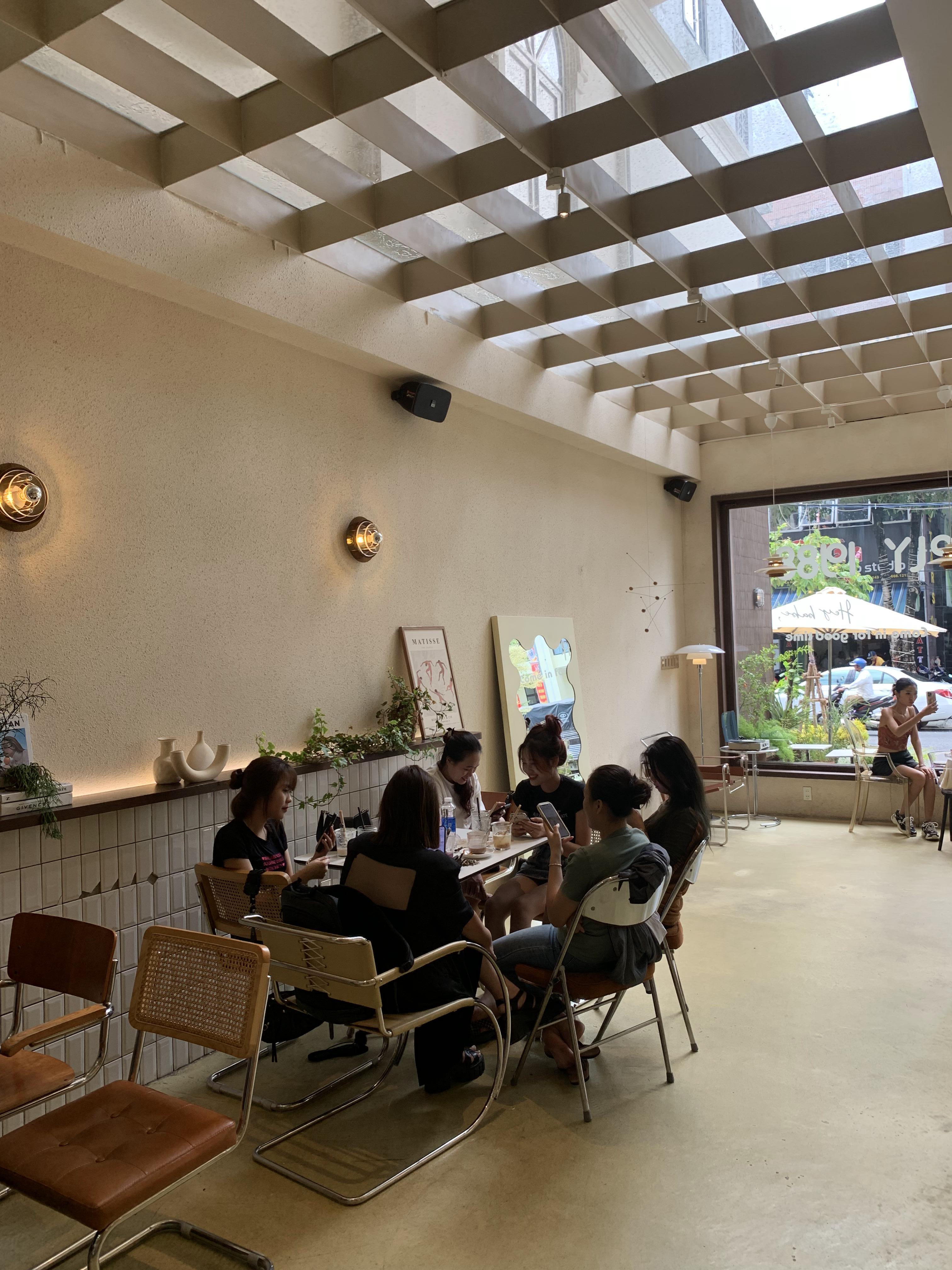 천장에는 자연스러운 채광이 드는 유리 천장과 그리드를 볼 수 있었다. 한국 카페에서 많이 보이는 요소를 잘 가져와서 반영한 것 같았다.