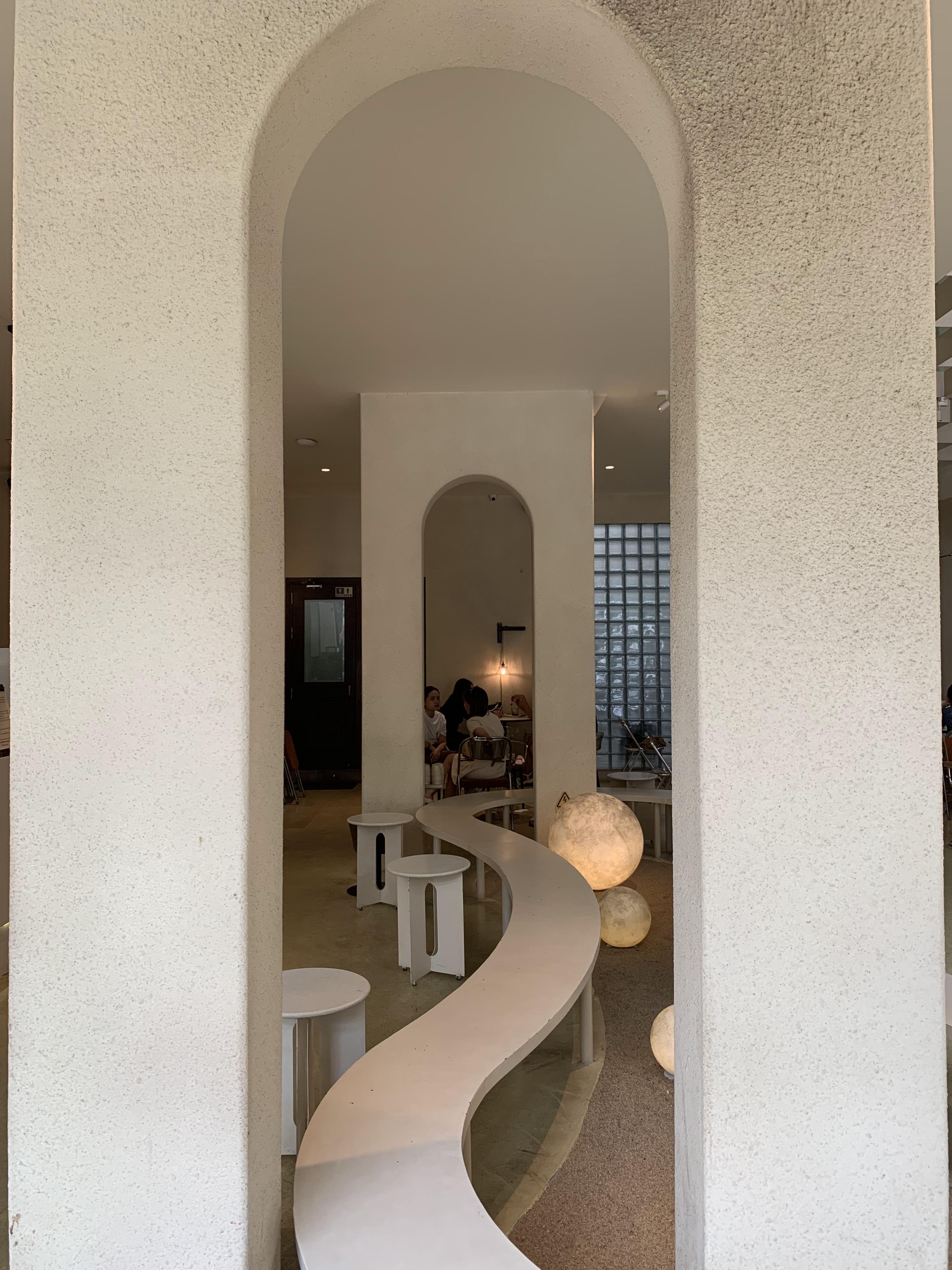 1층은 2층에 비해 여러 재밌는 요소들이 많았다. 중앙에 배치된 곡선형 철제의자와 의자를 밝혀주는 달 모양의 조명 오브제가 있어 공간에 힘을 주었다. 모래밭 위에 있는 달이 공간을 신비롭게 만들어준다.