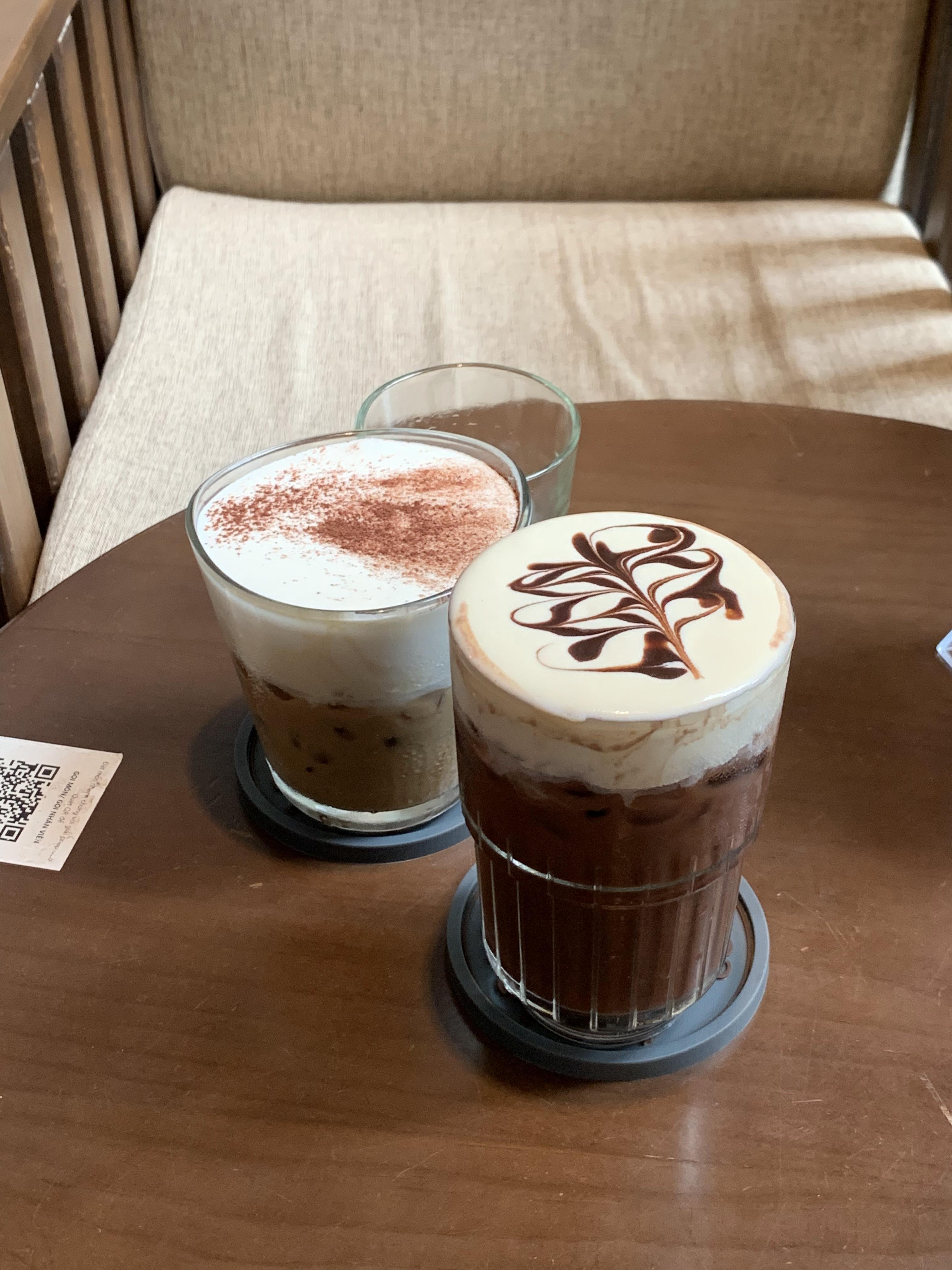 시나몬 파우더가 들어간 커피와 솔트아이스코코아를 주문했다. 각 층마다 주문을 받으시는 분이 계셔서 곧 바로 주문이 가능했다. 위의 크림은 매우 꾸덕하고 짠맛의 강도도 강해 단짠단짠을 제대로 느낄 수 있는 맛이었다.