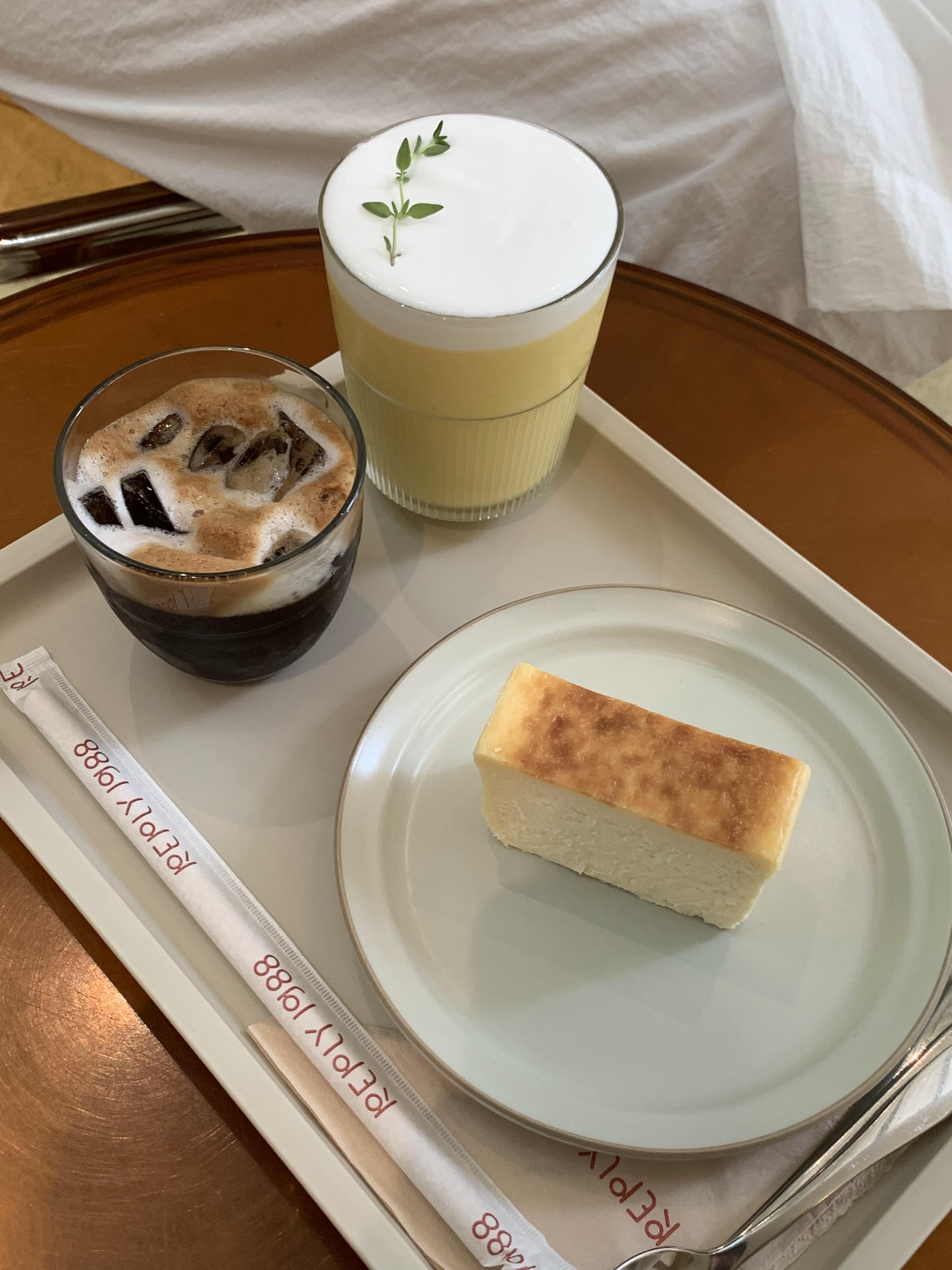 케이크와 빵 종류도 많이 있었다. 아침 시간에 방문하여 치즈 케이크 1조각과 커피, 망고가 들어간 음료를 주문하였다.