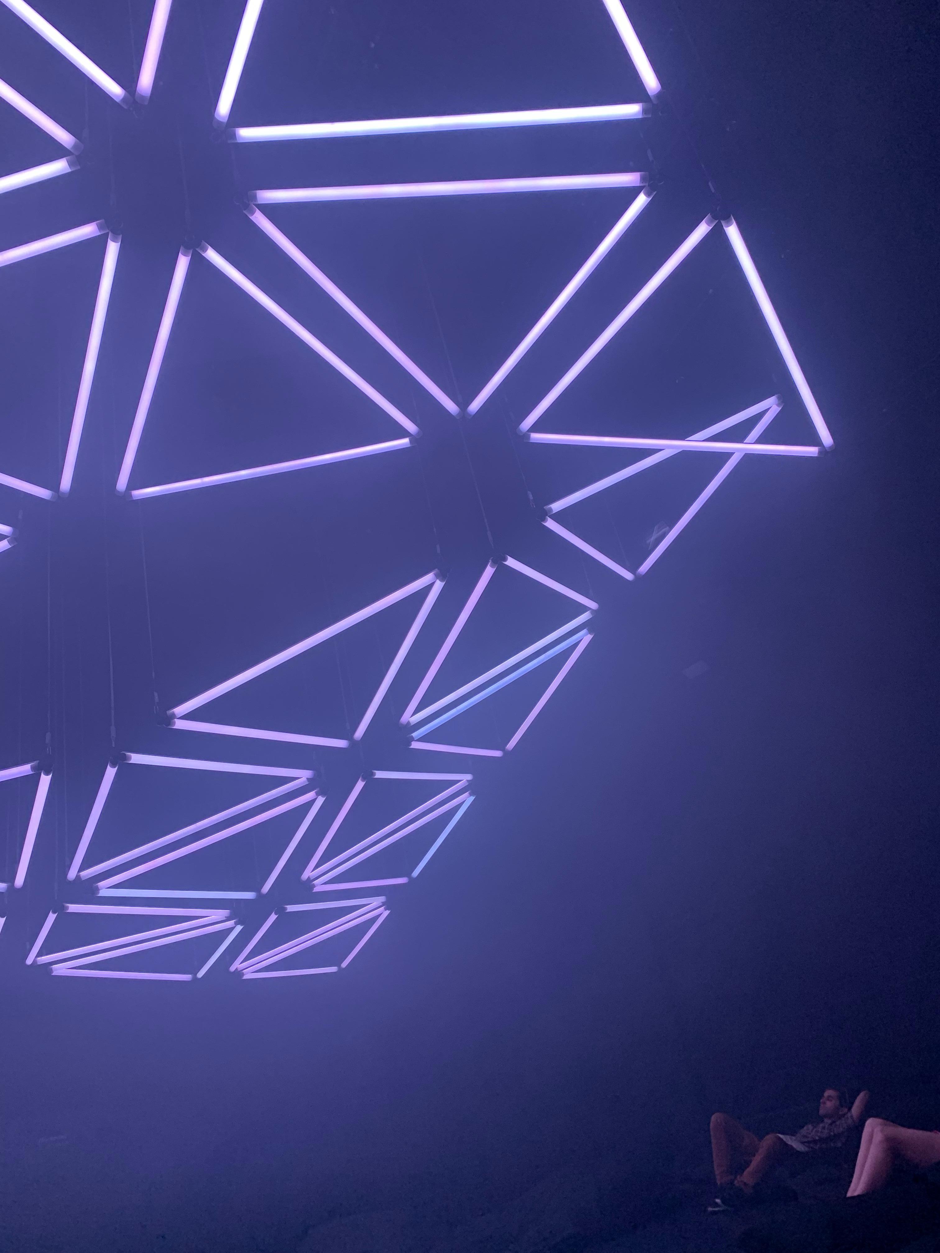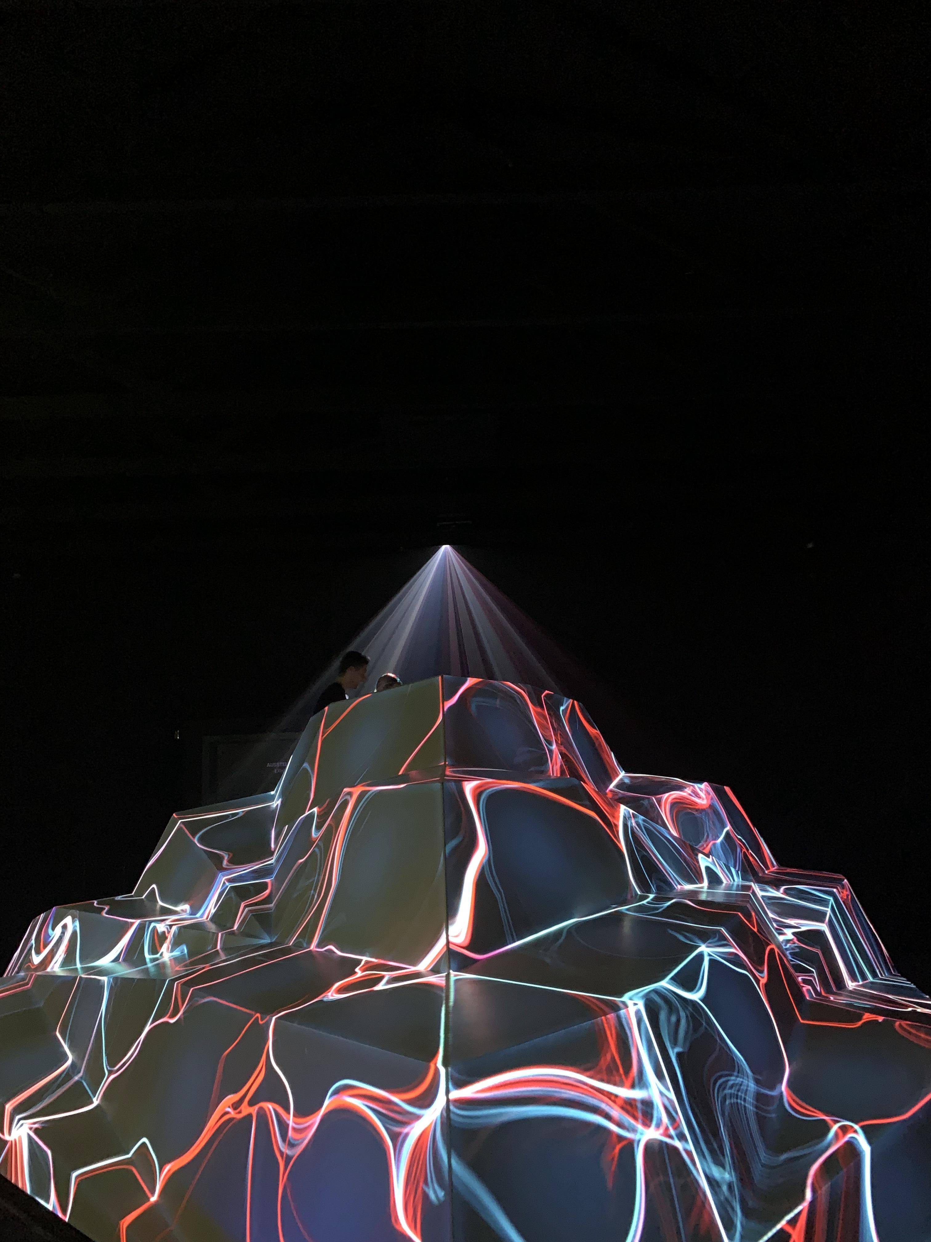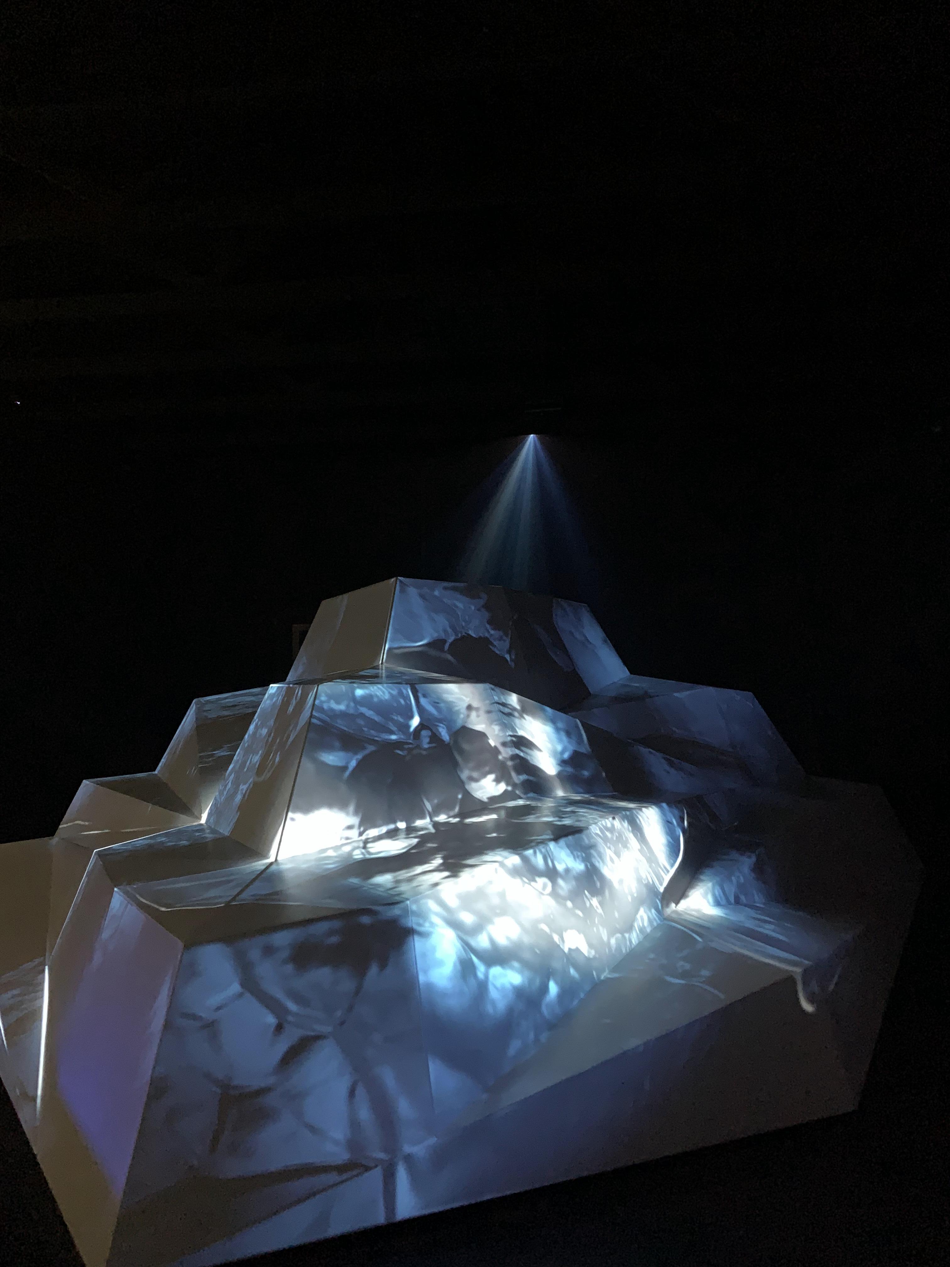 빙산 조각같아 보이는 폴리곤 조각 위로 움직이는 빛의 모양이 맵핑된 전시이다.