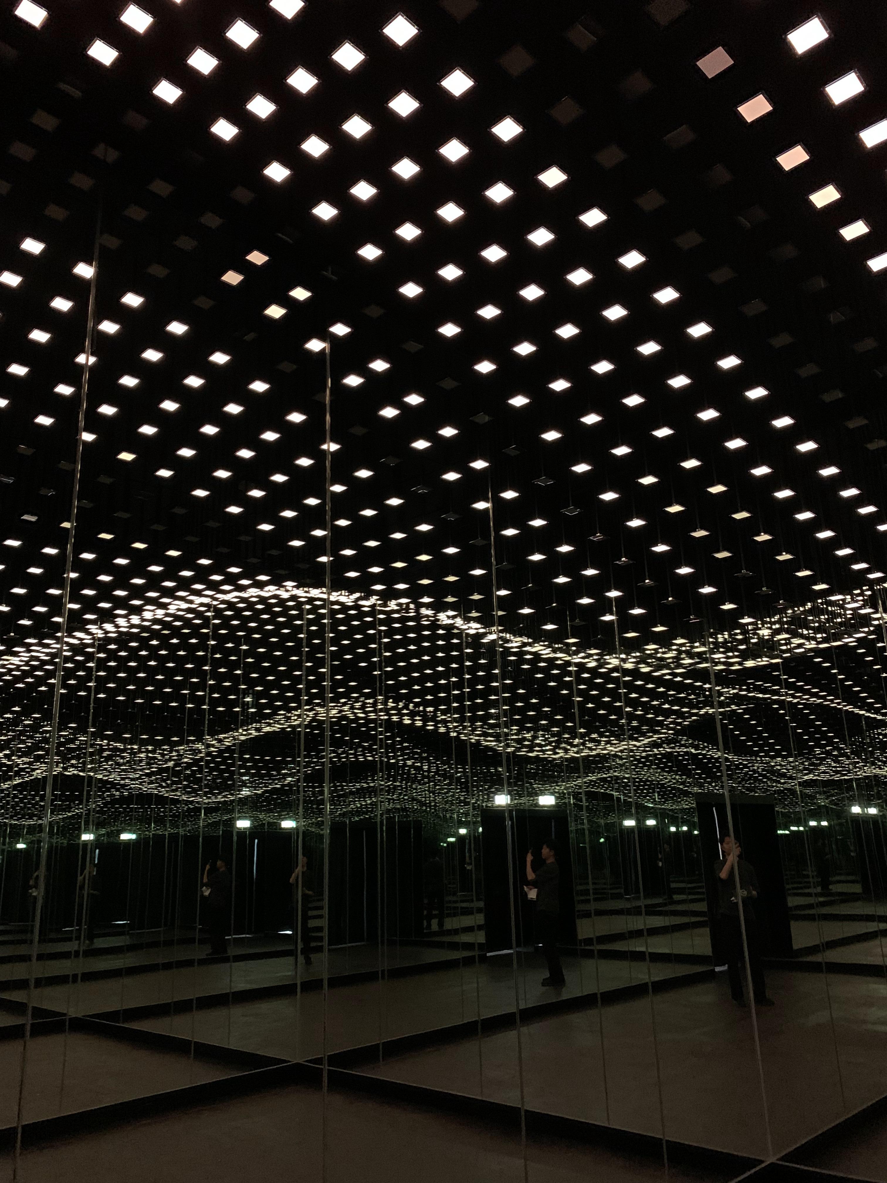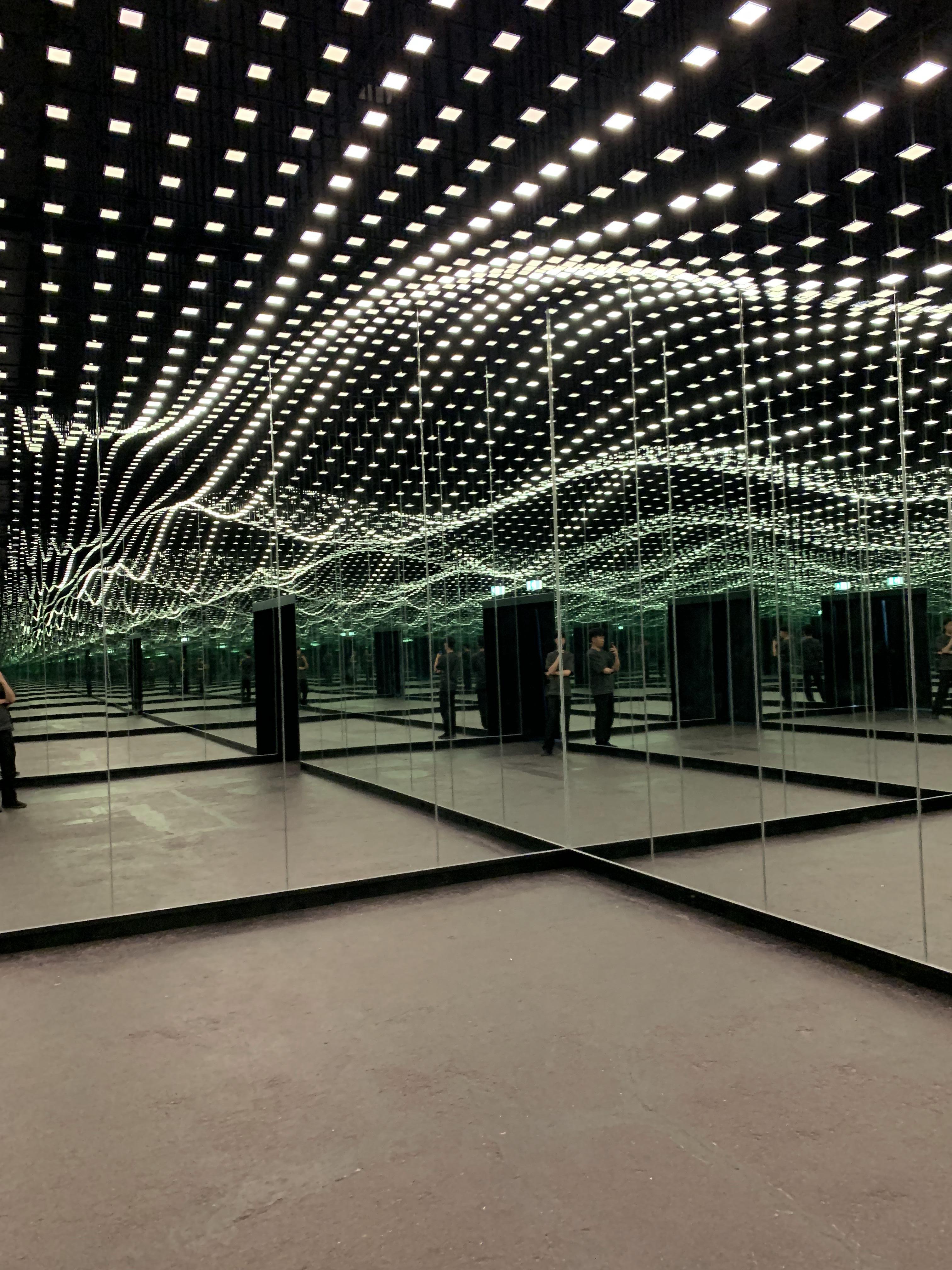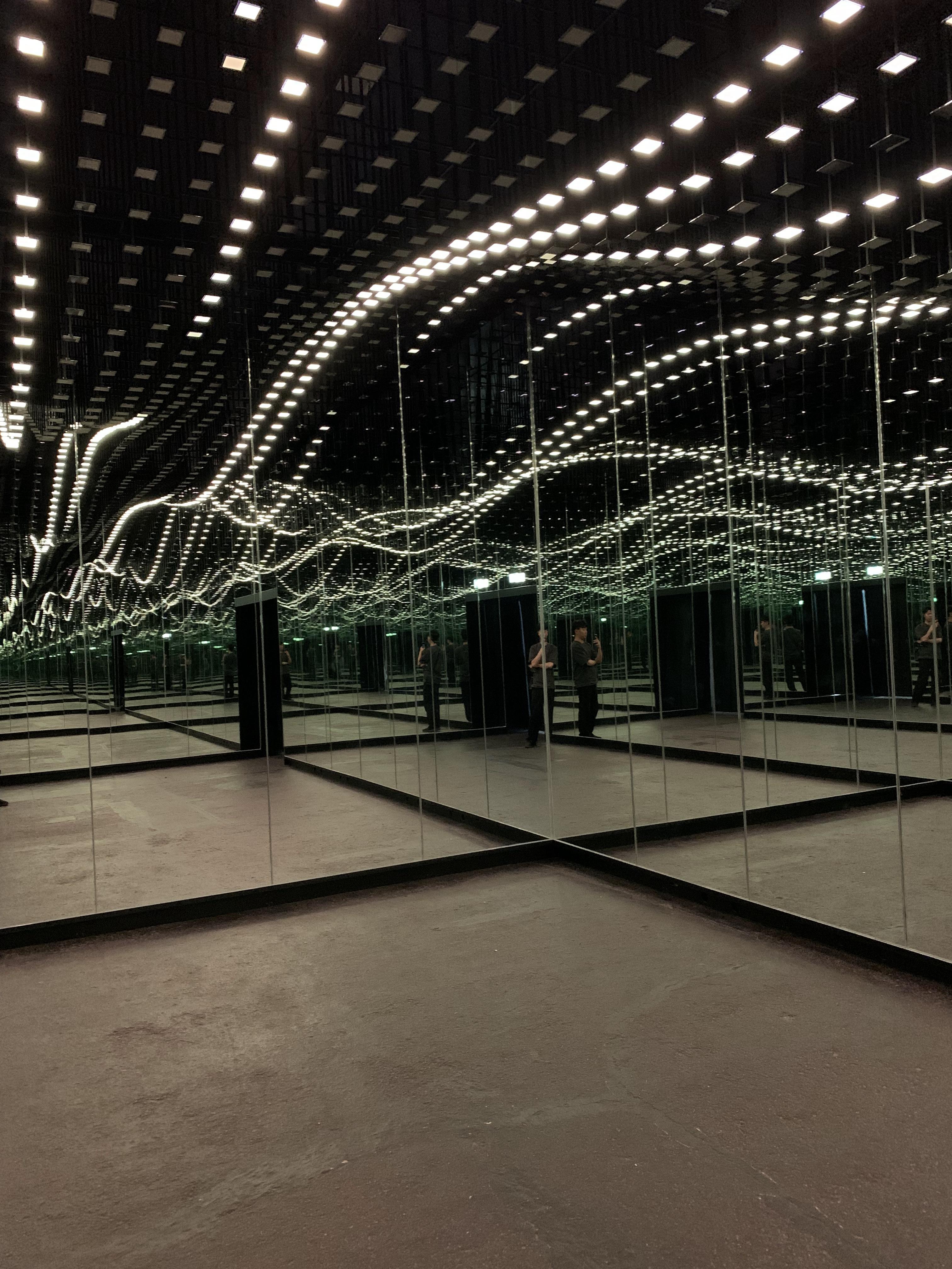 사방이 모두 거울로 되어있어 무한한 공간속 가운데에 관람객이 빛의 이야기를 볼 수 있도록 의도하였다.