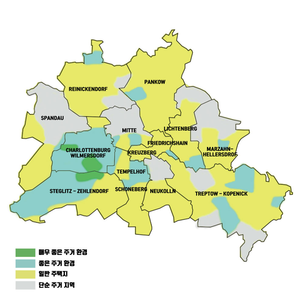 베를린에서의 안전한 구역, 조심해야 할 구역들을 색깔별로 구분한 지도이다. 짙은 초록색이 매우 좋은 주거 환경, 청록색이 좋은 주거 환경을 나타내는 구역이다. 노란색 부분은 일반적인 주거 환경을 가지고 있으며 회색으로 표시된 부분은 비교적 지내는데 유의를 해야하는 부분이다. 주거 환경에 따라 홈리스들이 적고 사건 사고도 일어날 확률이 매우 적기 때문에 베를린에서 숙소나 호텔을 구할때 위의 지도를 참고하여 계획을 하면 되겠다.