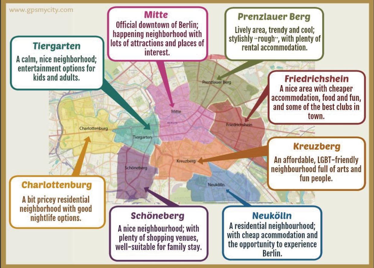 베를린을 처음 방문하거나 단기간 체류할 경우 미떼 주변으로 숙소를 잡는 것을 권장한다. 미떼 지구 내에서도 위의 지도에서 보이는 초록색 지역으로 숙소를 계획한다면 관광지도 가까워 둘러보는데 시간을 아낄수 있다. 젊은 여행객들로 구성되어 있다면 프리드리히샤인 쪽을 추천한다. 좋은 음식점들과 가격도 좋으며 안전한 동네이다. 많은 클럽들이 동남쪽에 위치하고 있어 클럽 문화를 즐기기에는 이 프리드리히 샤인쪽에서 머무는 것이 좋다. 가족 단위 관광객들은 가장 안전한 샬로텐부르크 쪽이나 베를린 동물원 쪽에 머무는 것을 추천한다. 한국으로 따지만 강남 같은 부촌이라 생각하면 쉽겠다.