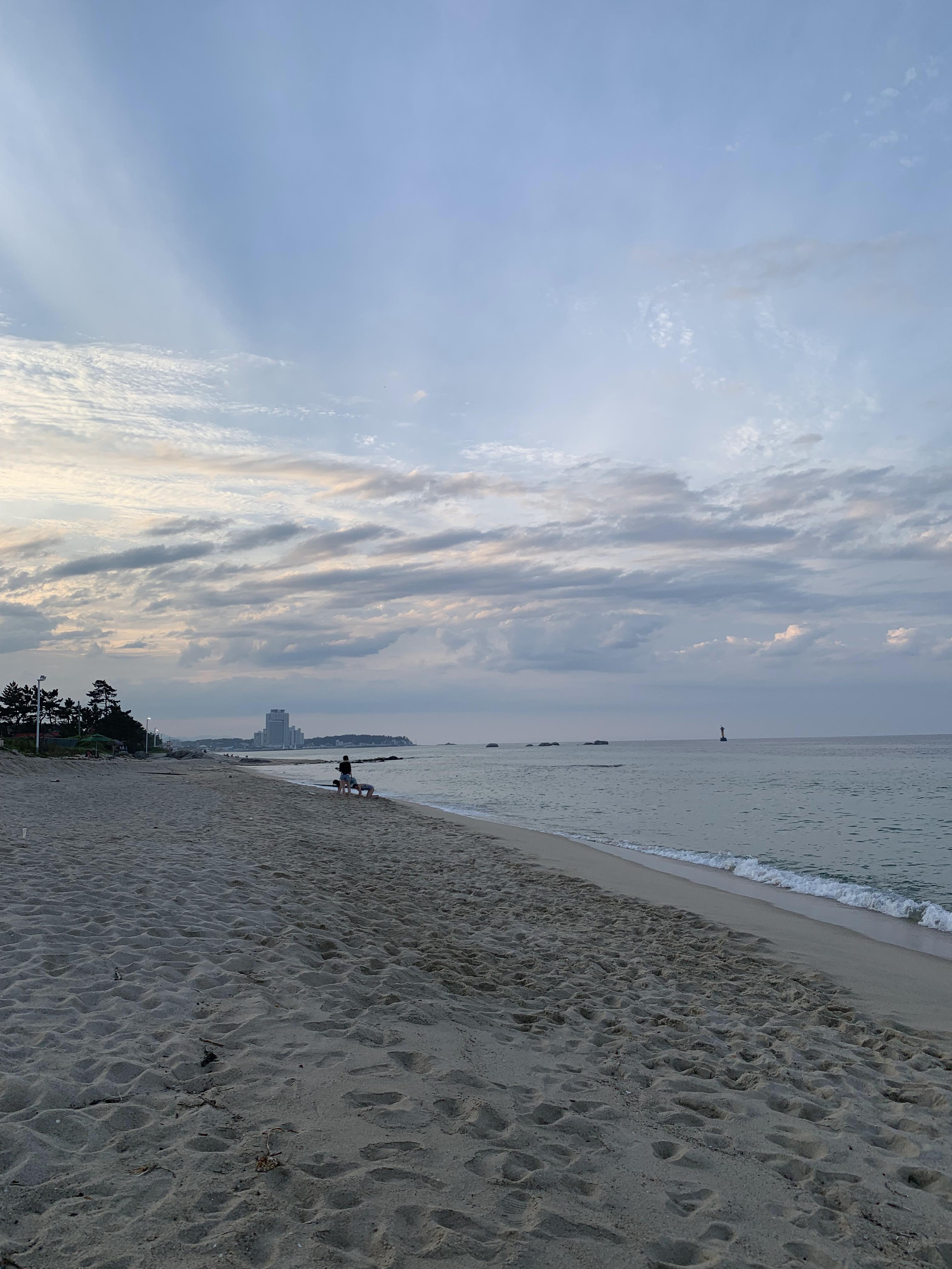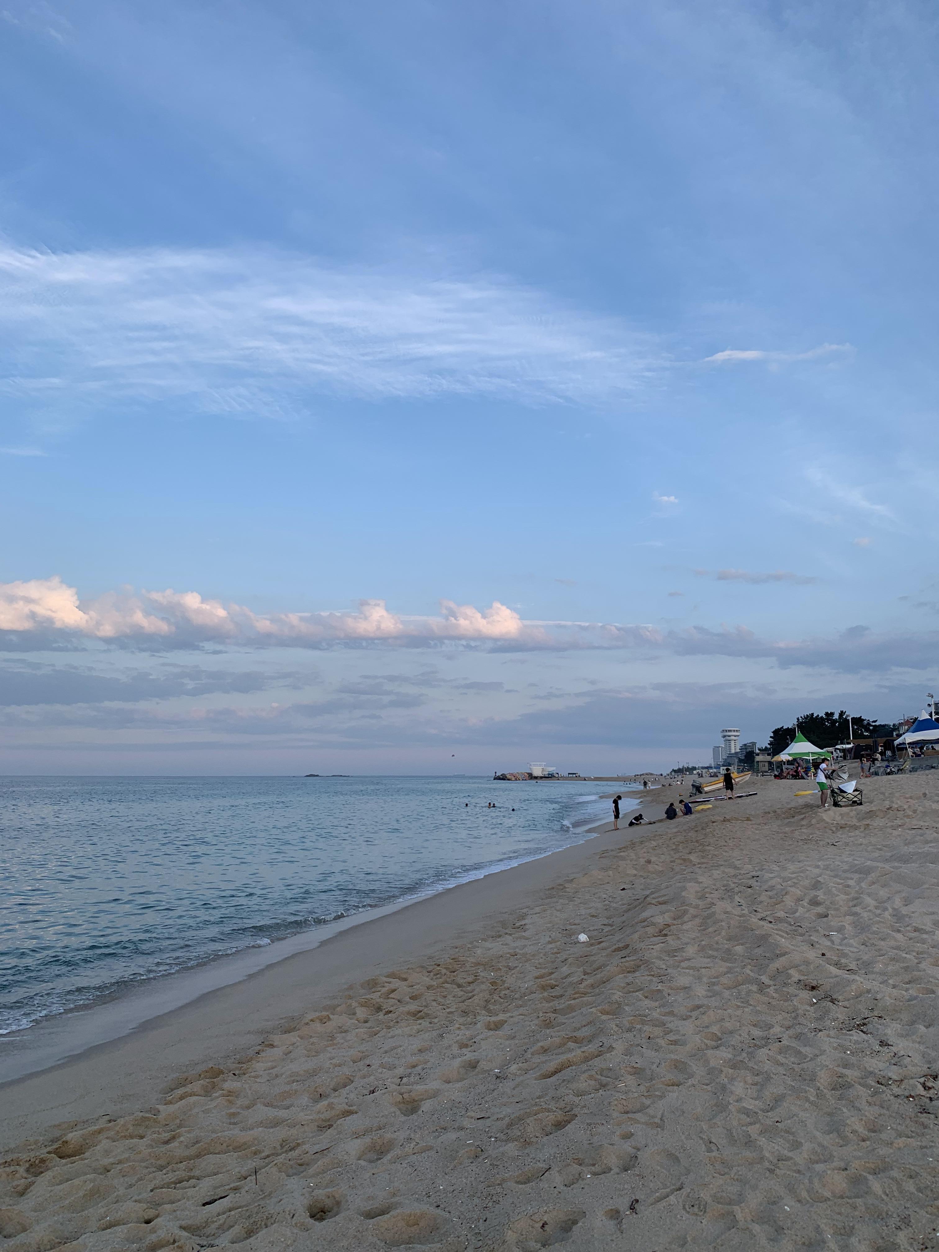 하코네 펜션에 도착하자마자 순긋 해변으로 바로 물놀이를 하러 갔다. 신나게 준비해온 물놀이 도구와 안전 장비를 한아름 들고 순긋 해변으로 가는 모습. 오후 4시 쯤 도착했지만 붐비지 않아서 좋았다. 날씨도 좋아 물놀이를 해도 전혀 춥지 않은 날씨였다.