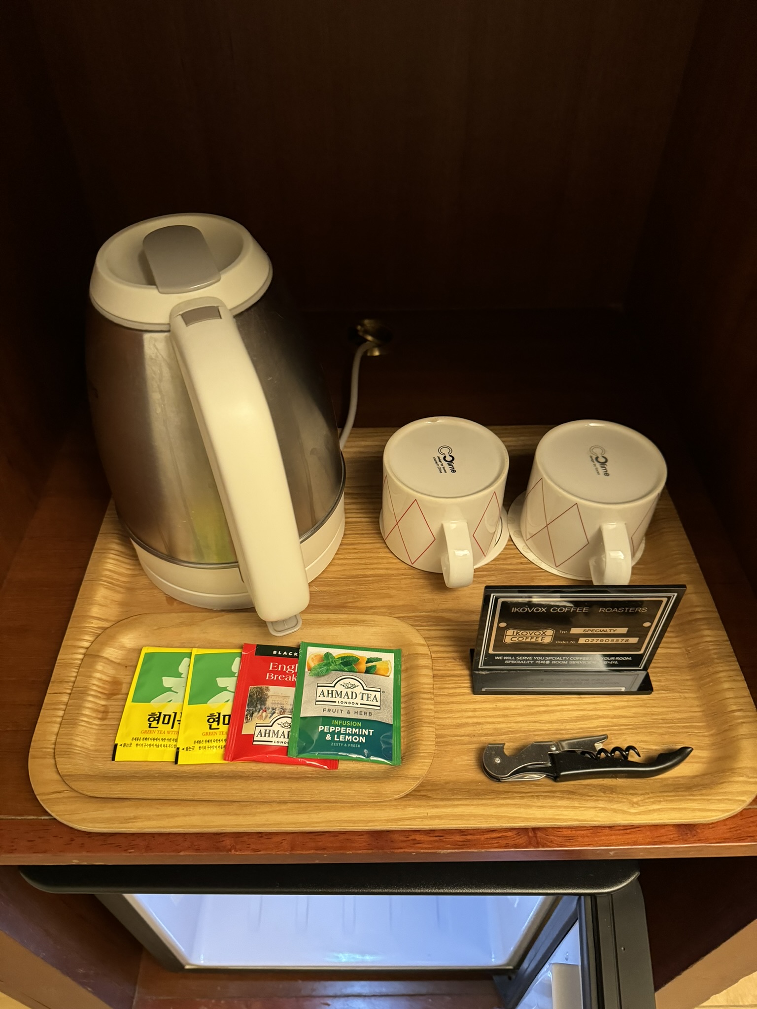3병의 생수병과 커피 포트, 와인오프너, 컵이 있다.