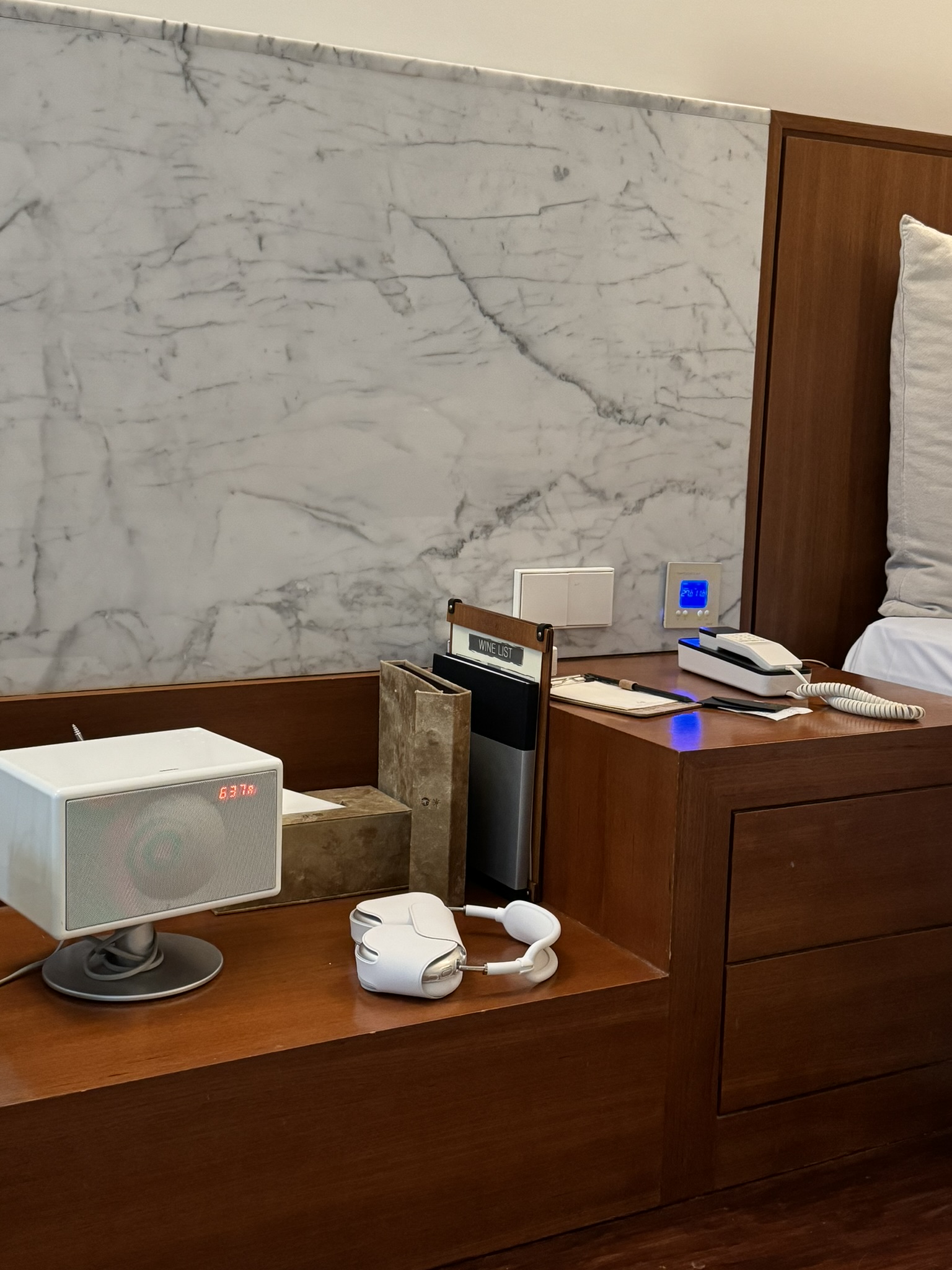 블루투스 스피커와 호텔 가이드 북이 보인다.