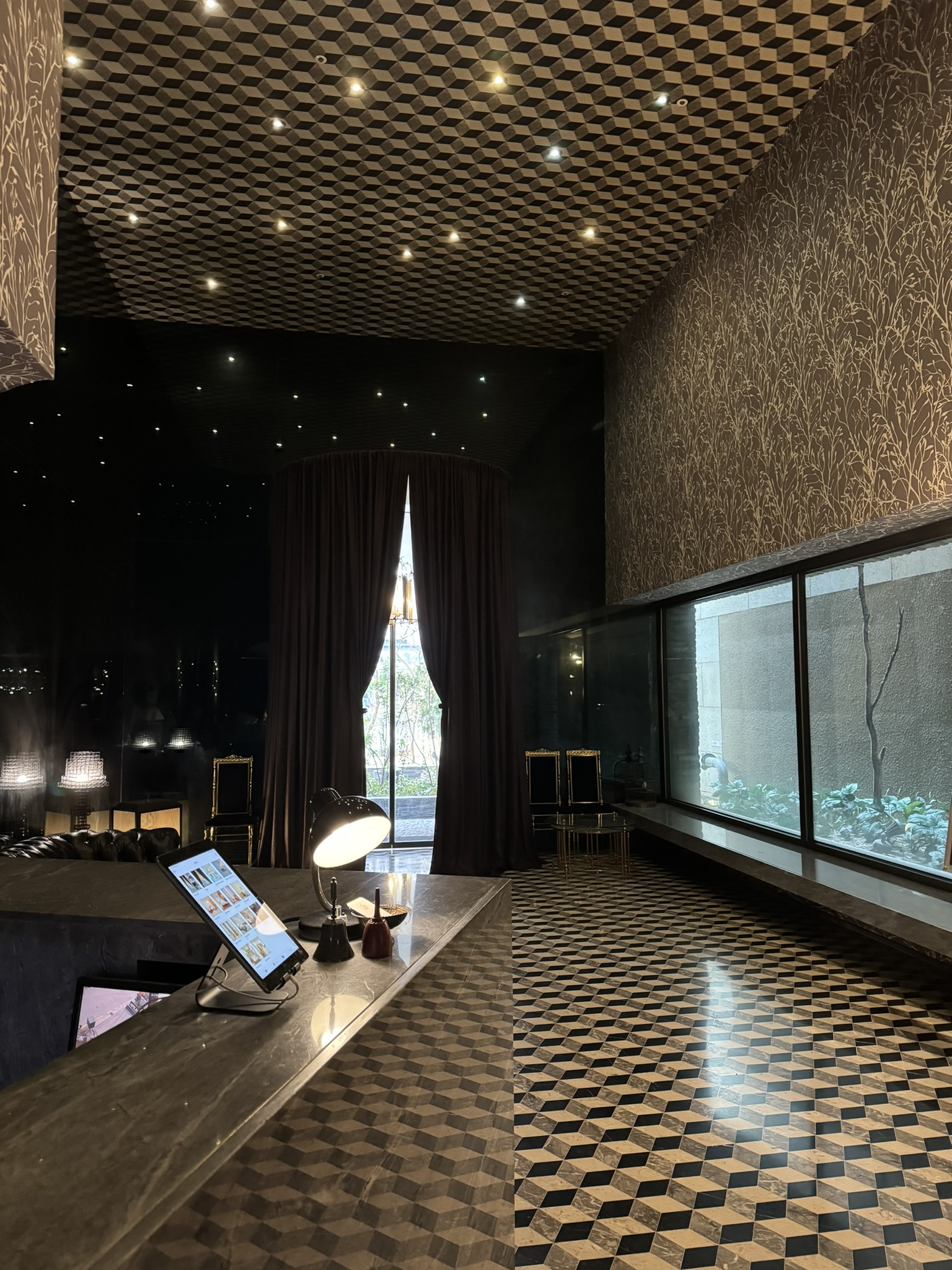 육면체 패턴의 바닥과 천장, 특이한 오브제들이 자리하고 있었다.