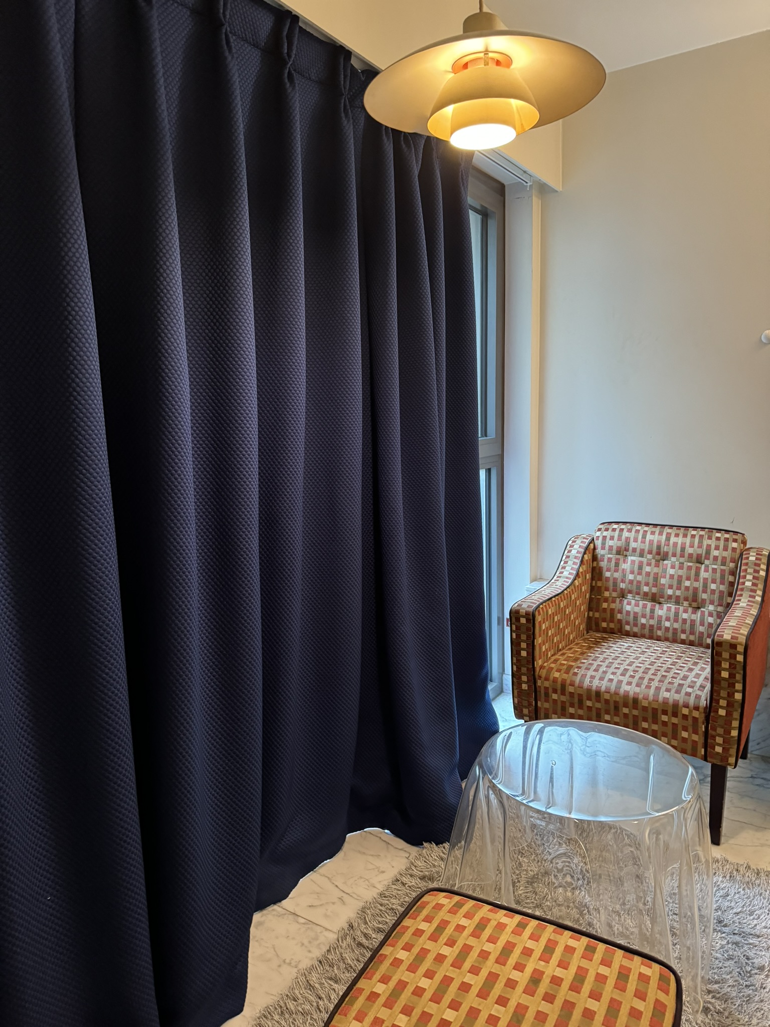 커튼으로 가려놓은 시티뷰와 테이블