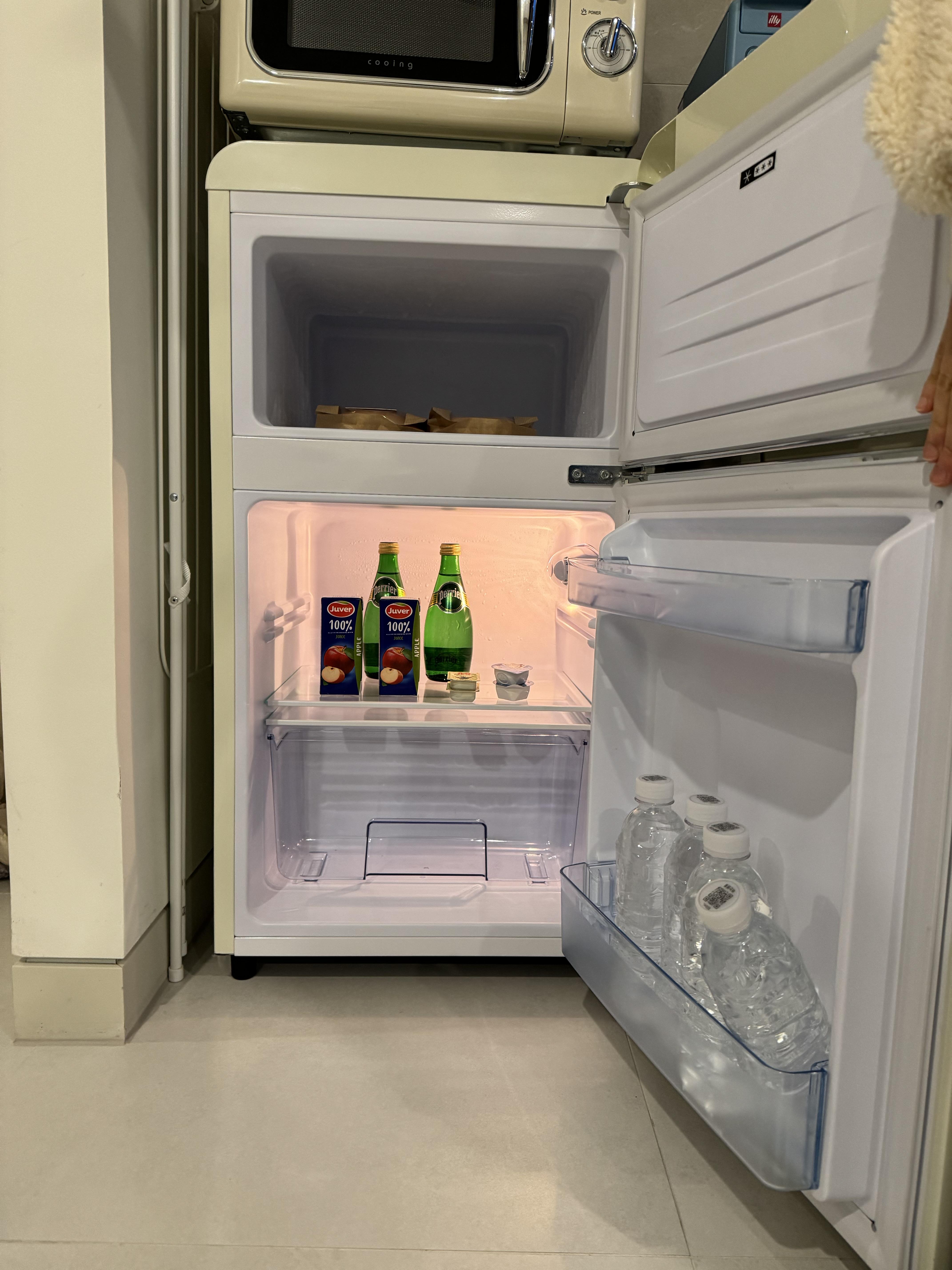 냉장고 안에는 사과 주스 2개, 탄산수 2개, 생수 4통, 베이글 2개, 잼, 버터 등 많은 요깃거리들이 있었다.
