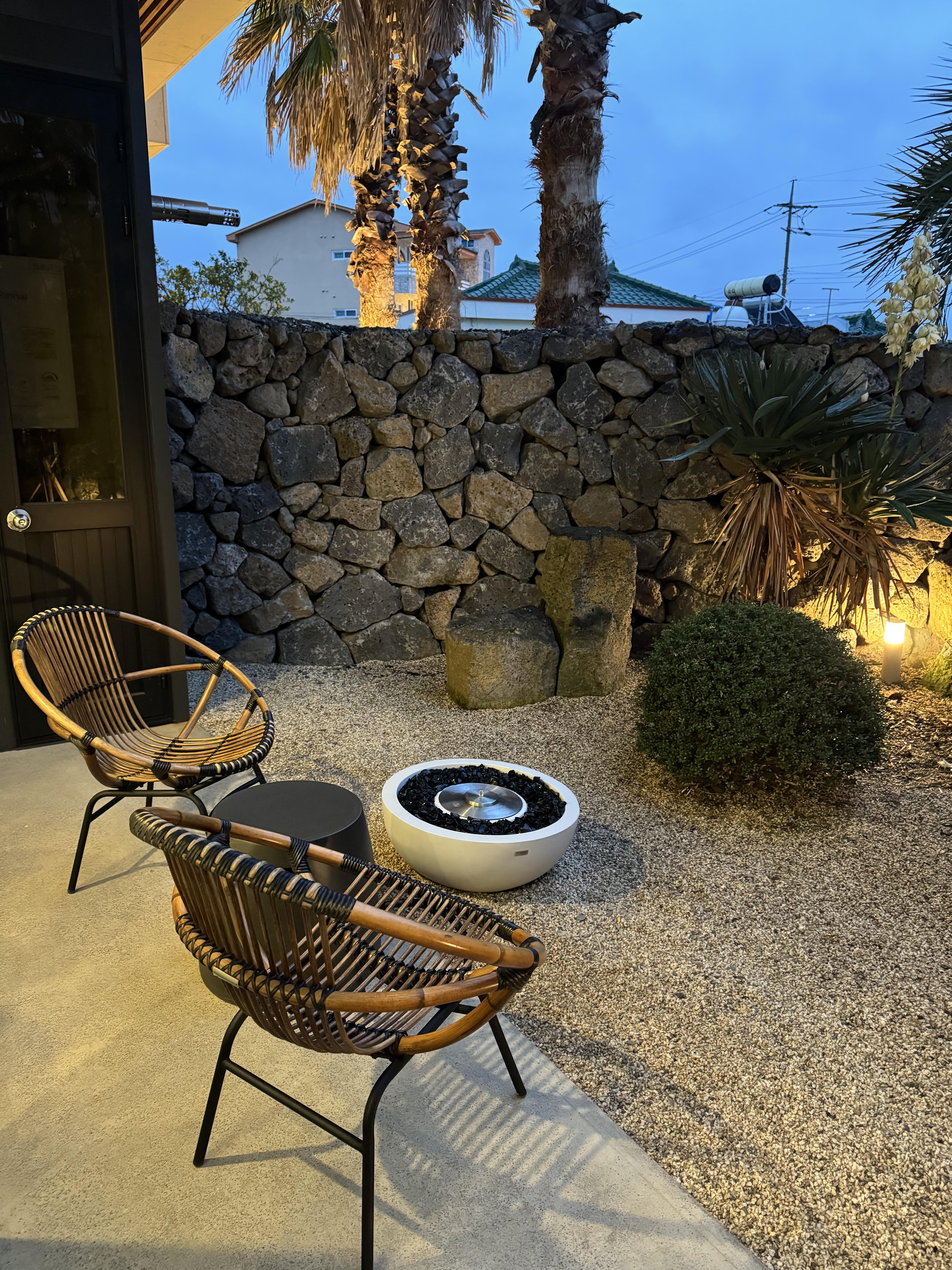 불멍을 할 수 있는 화로와 의자, 사이드 테이블이 있다.