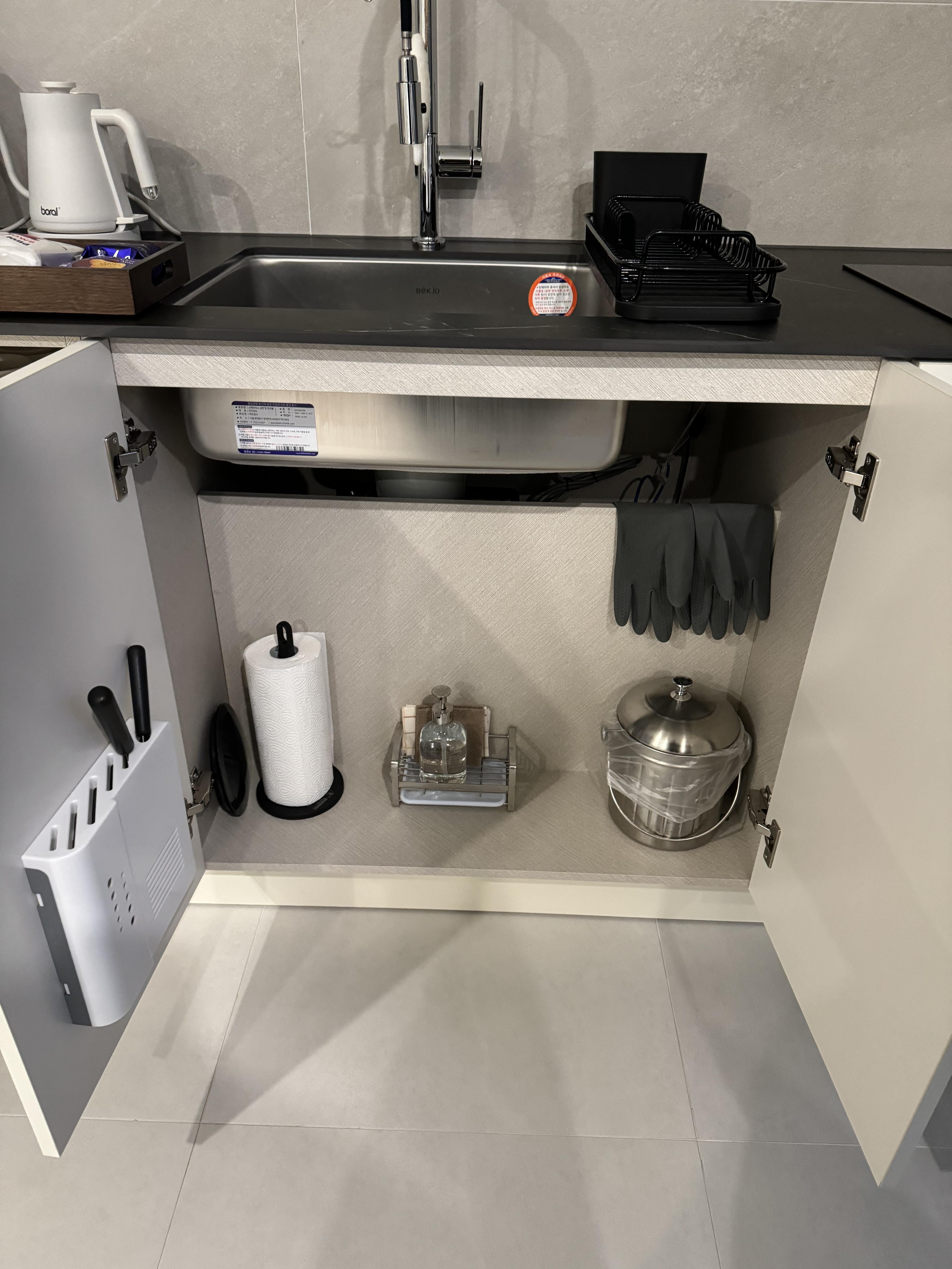 싱크대 하단부에는 칼 키친 타월, 음식물쓰레기통, 주방세제 등이 있다.