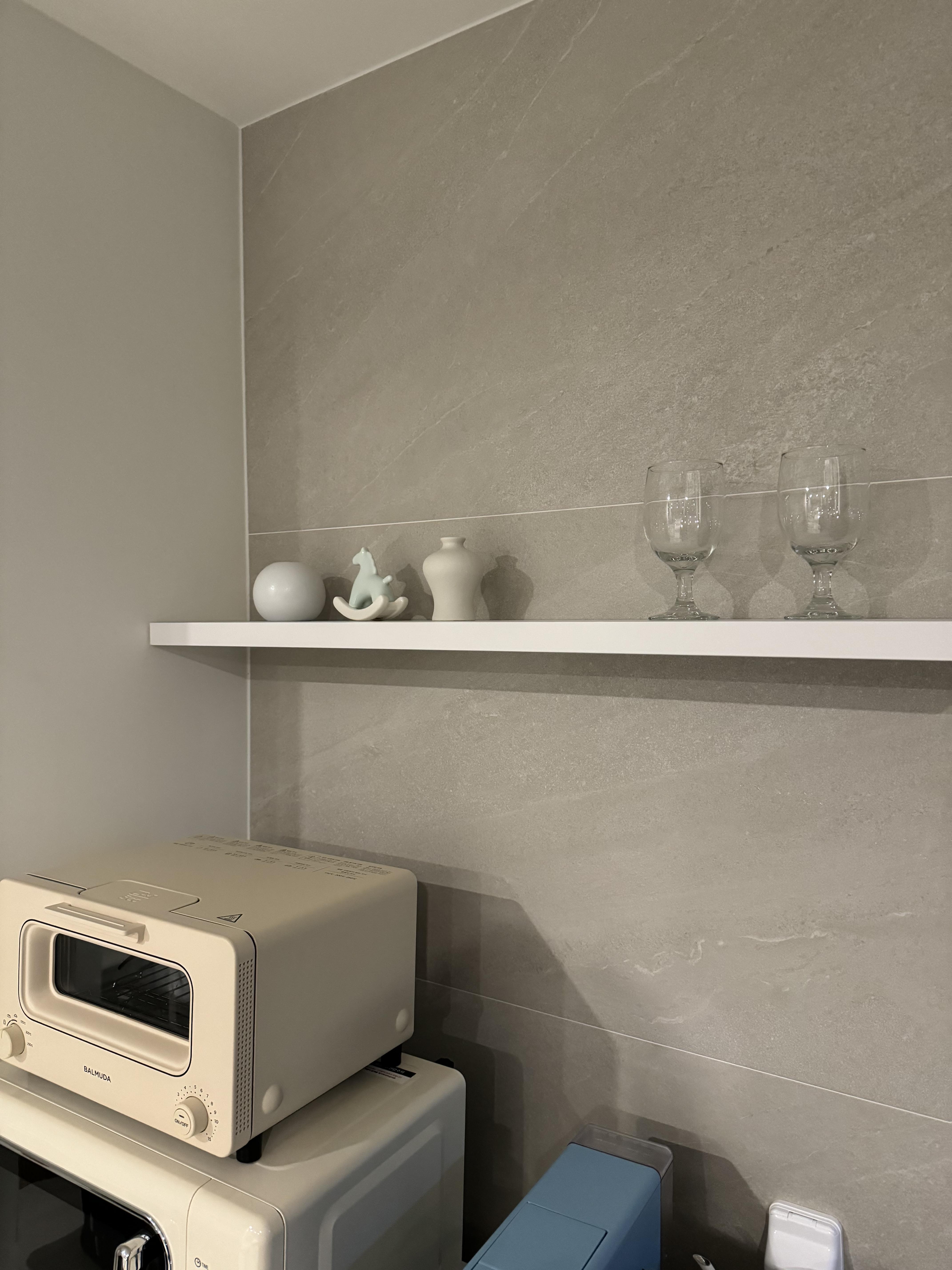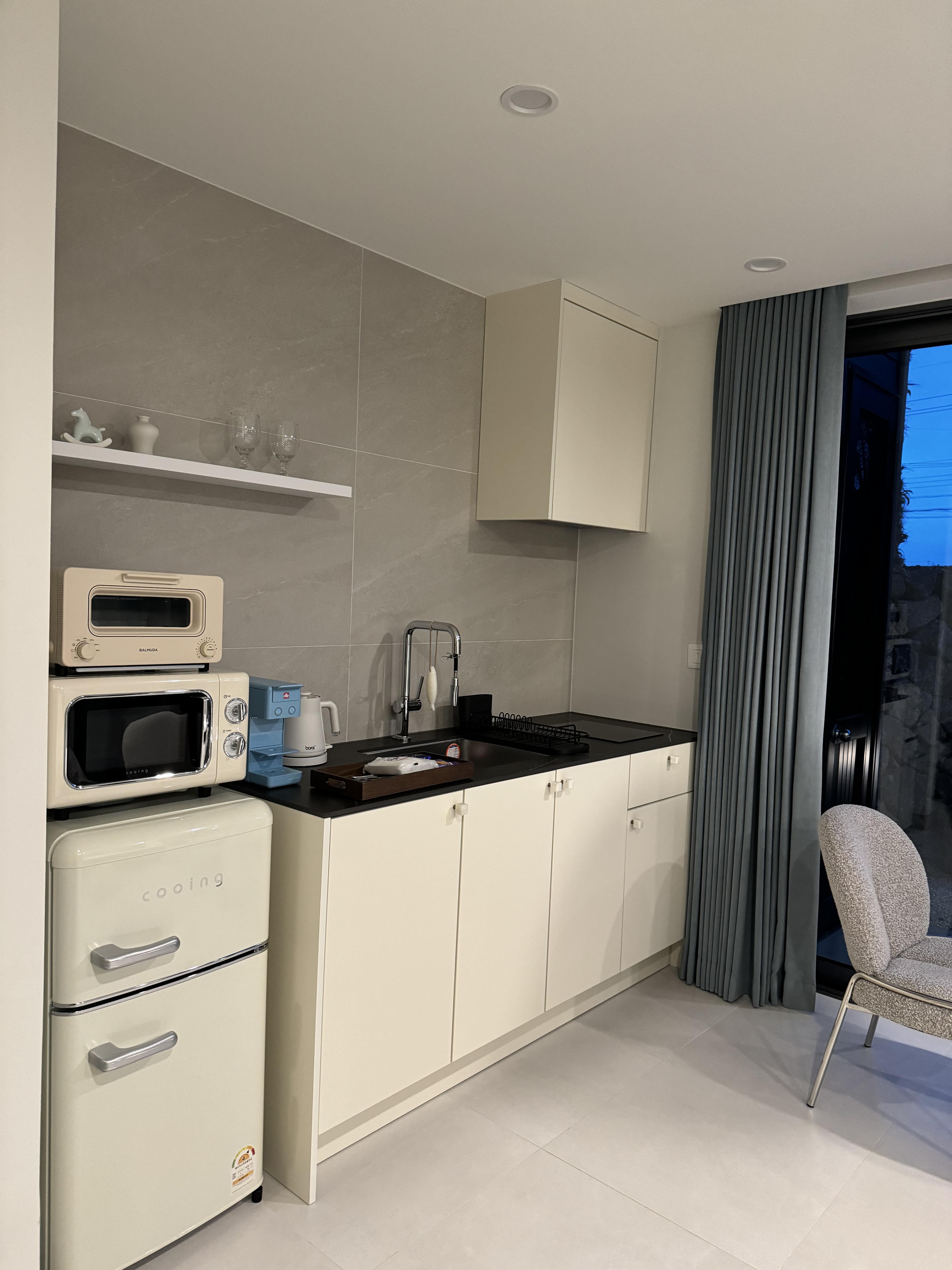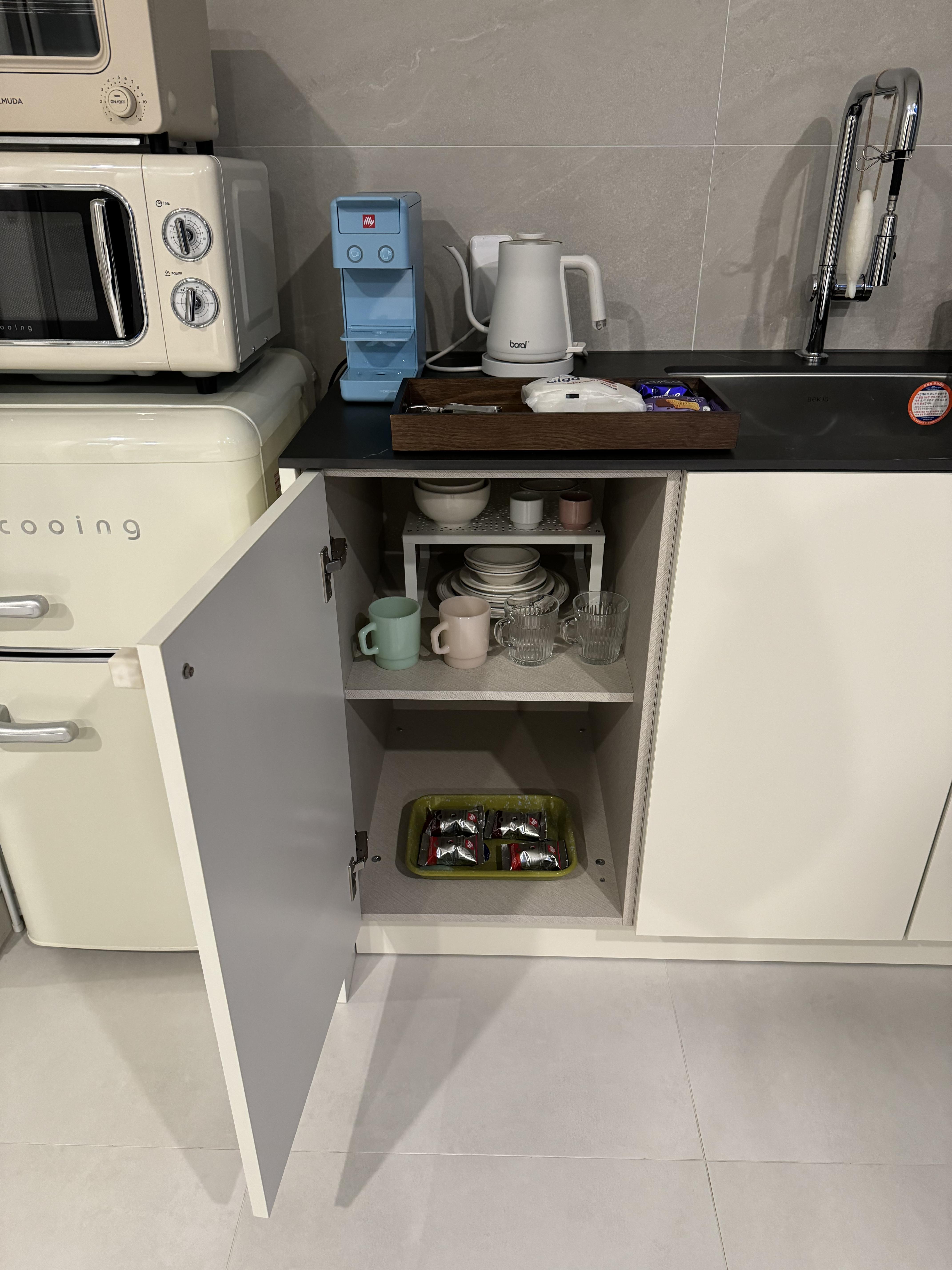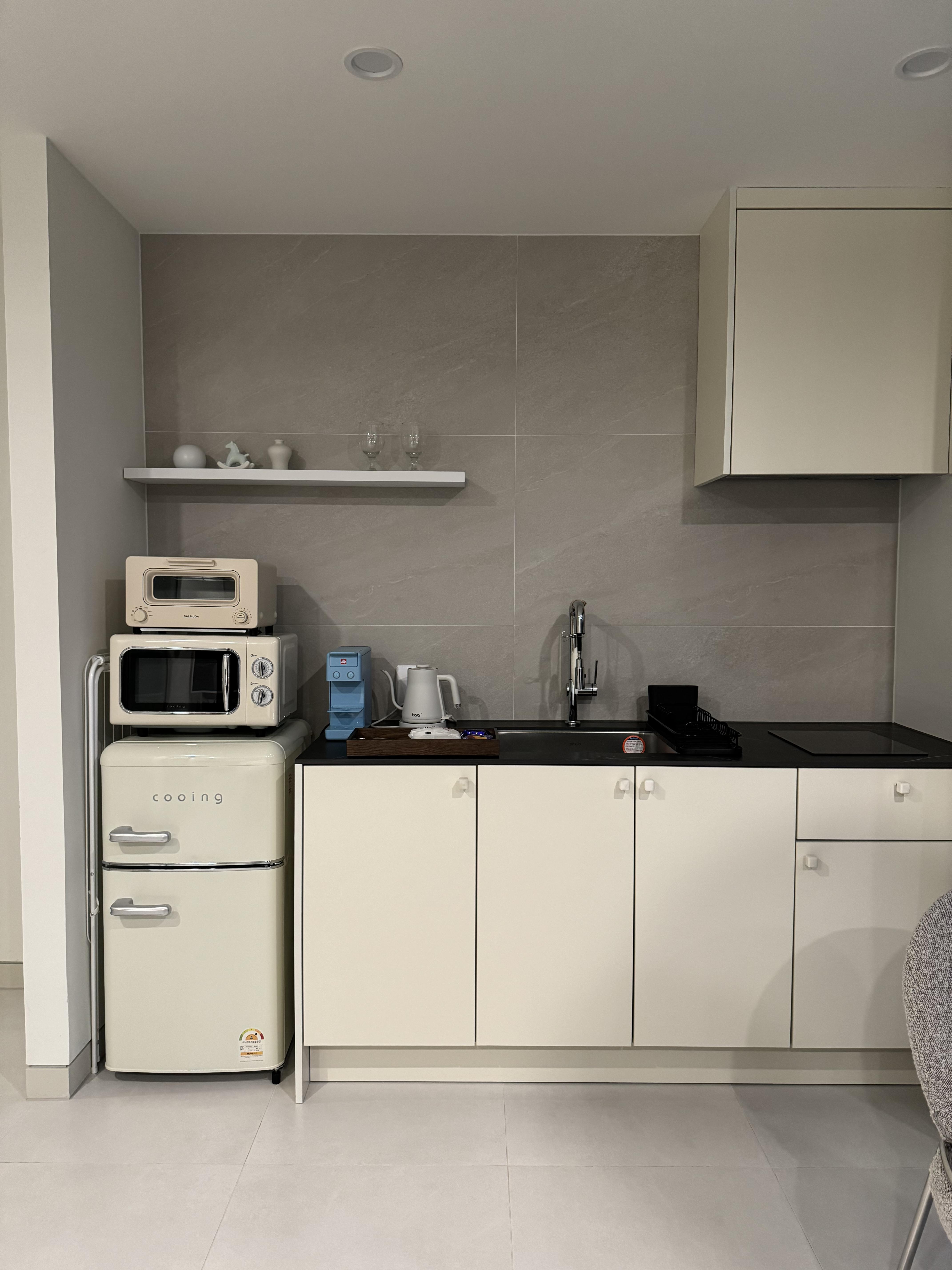 토스터기, 전자레인지, 냉장고, 캡슐커피기계, 커피포트가 보인다.