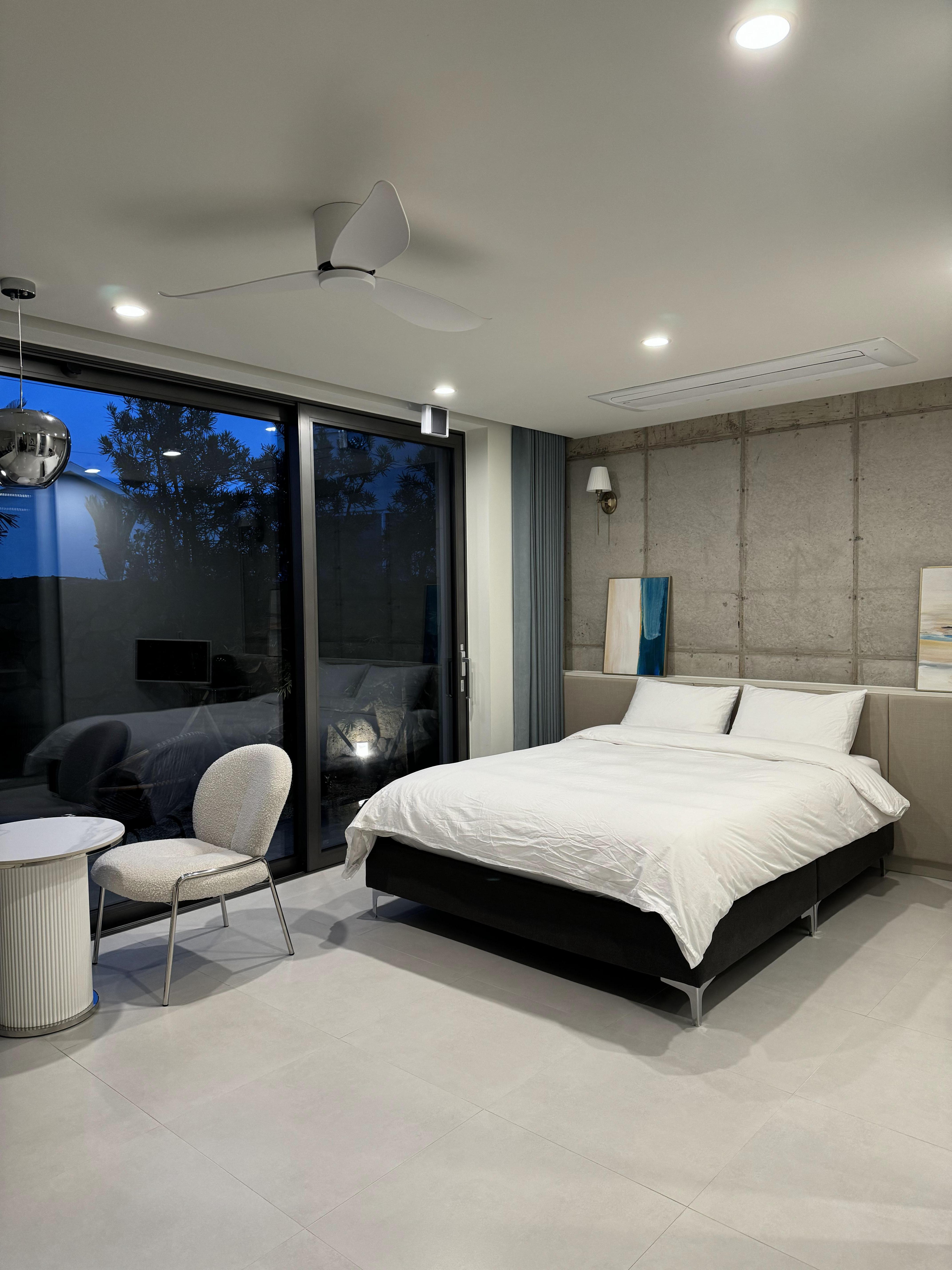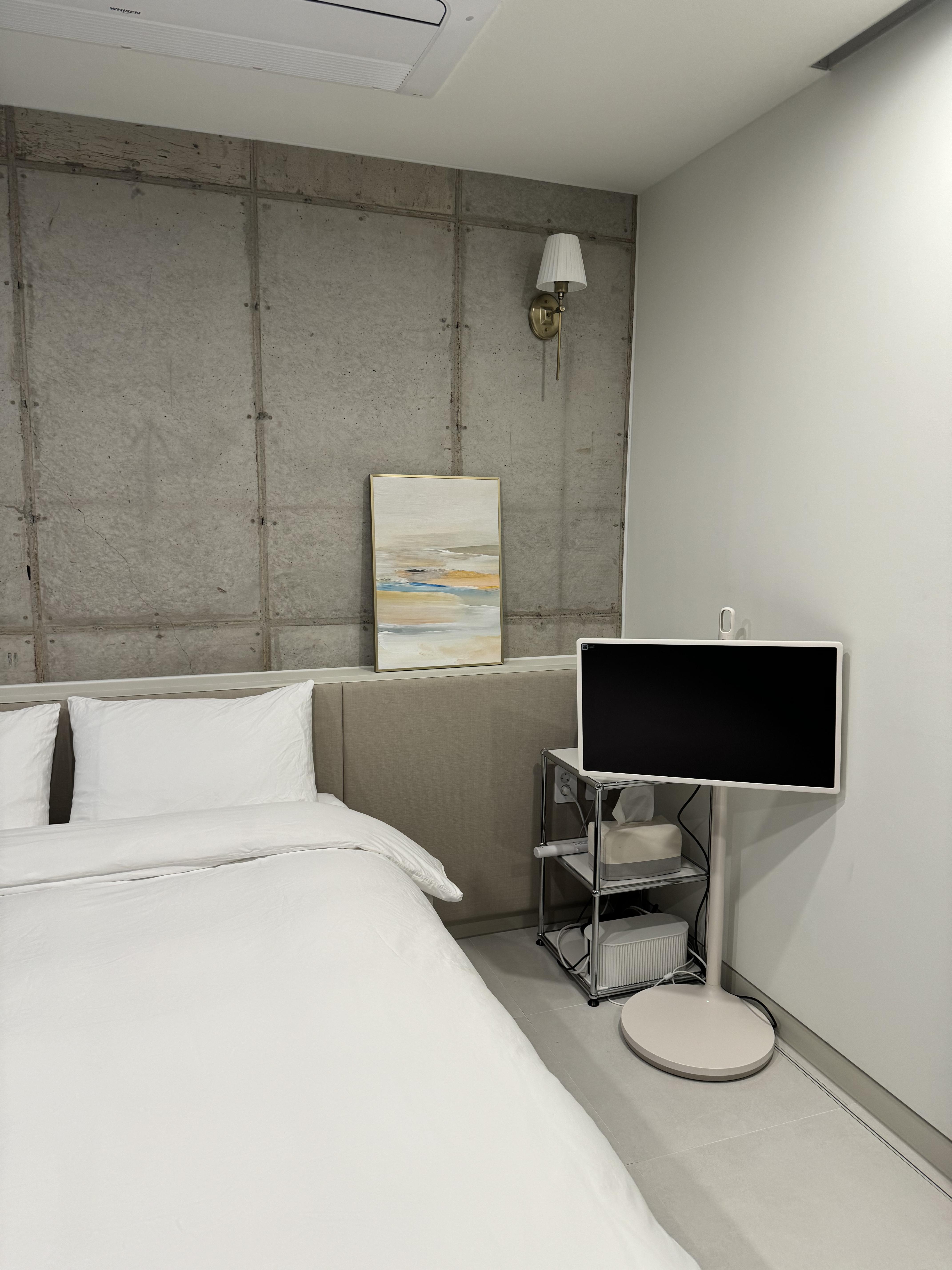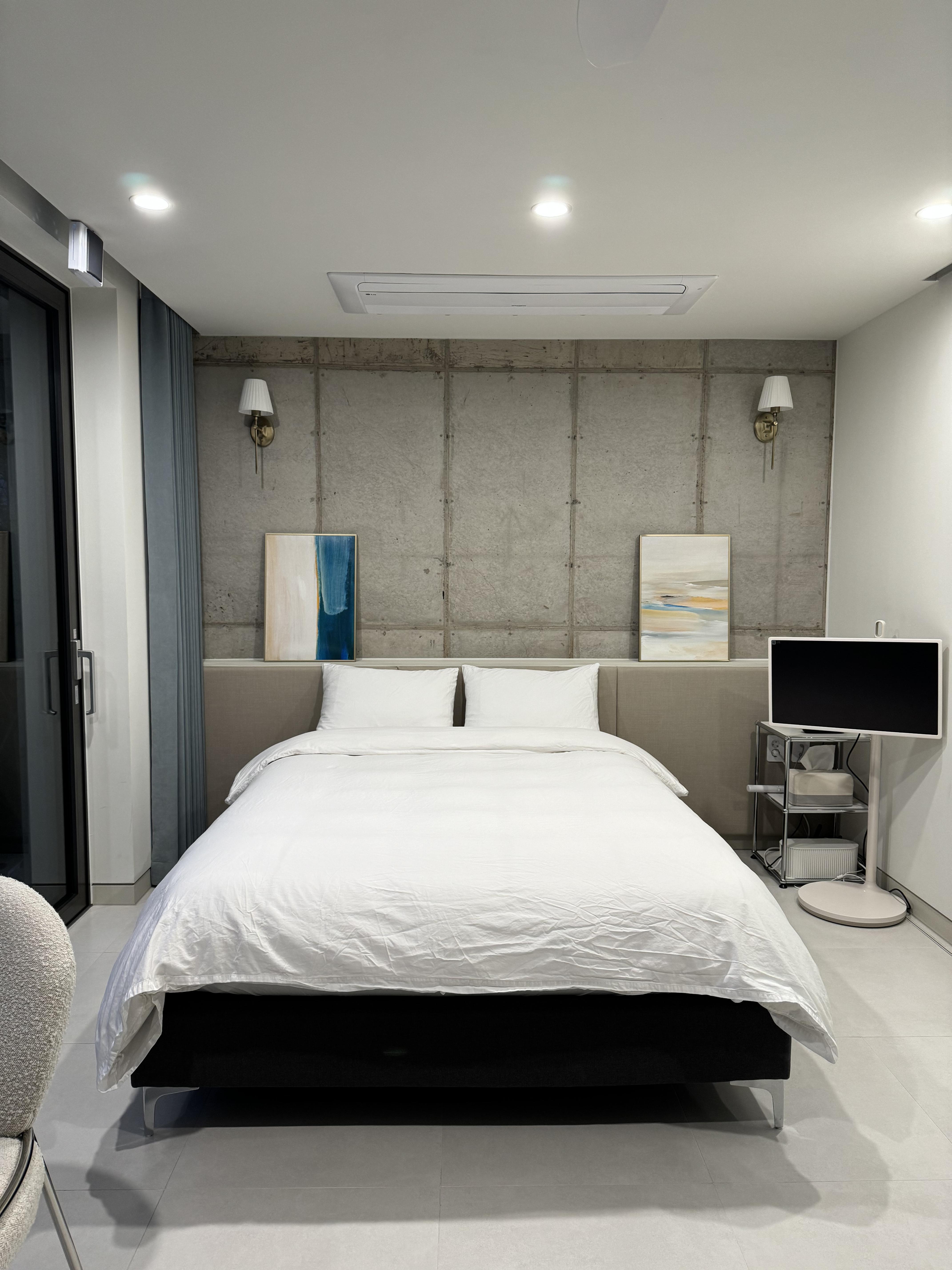 퀸 사이즈 베드와 차가운 질감의 벽이 보인다.