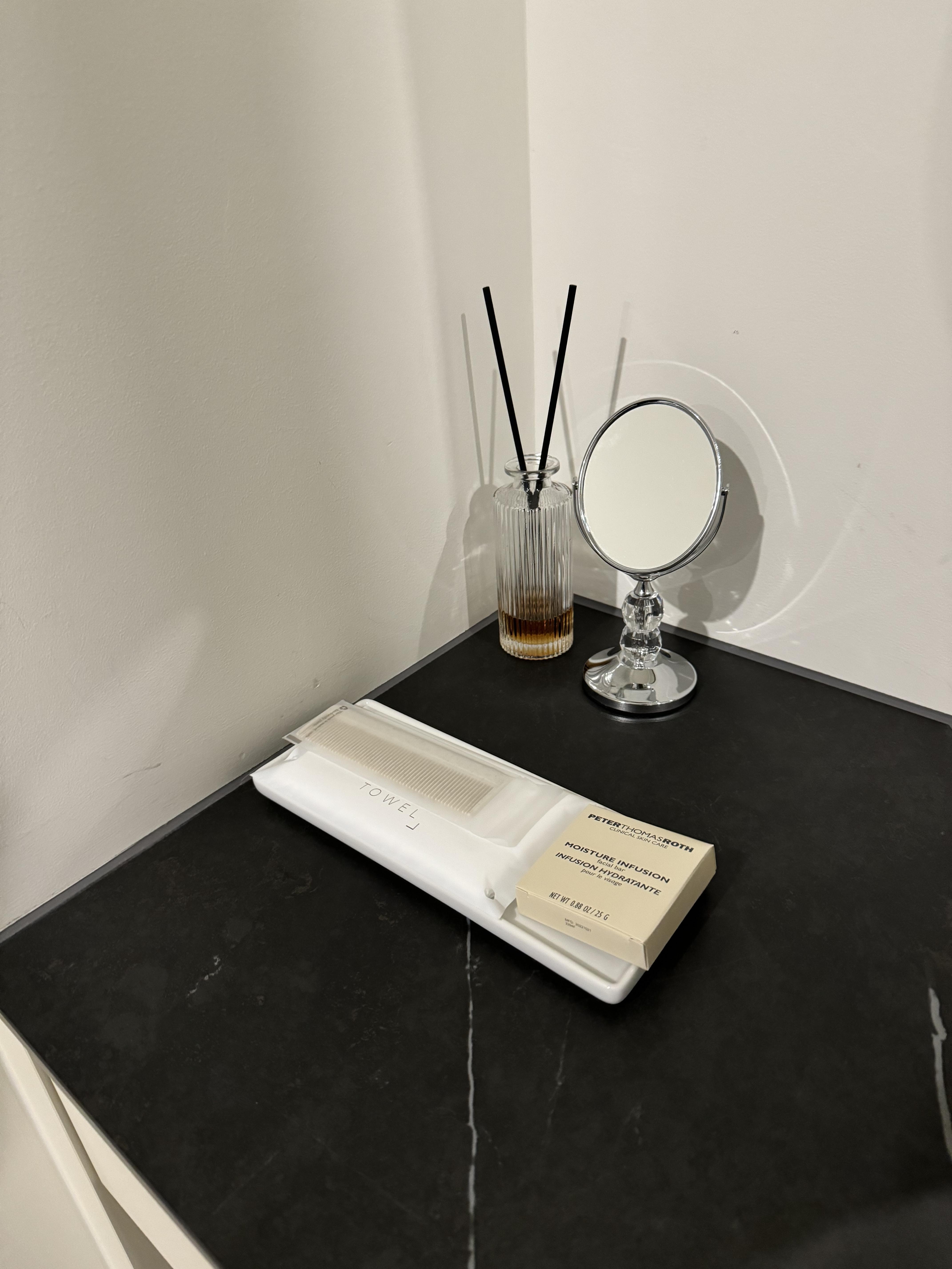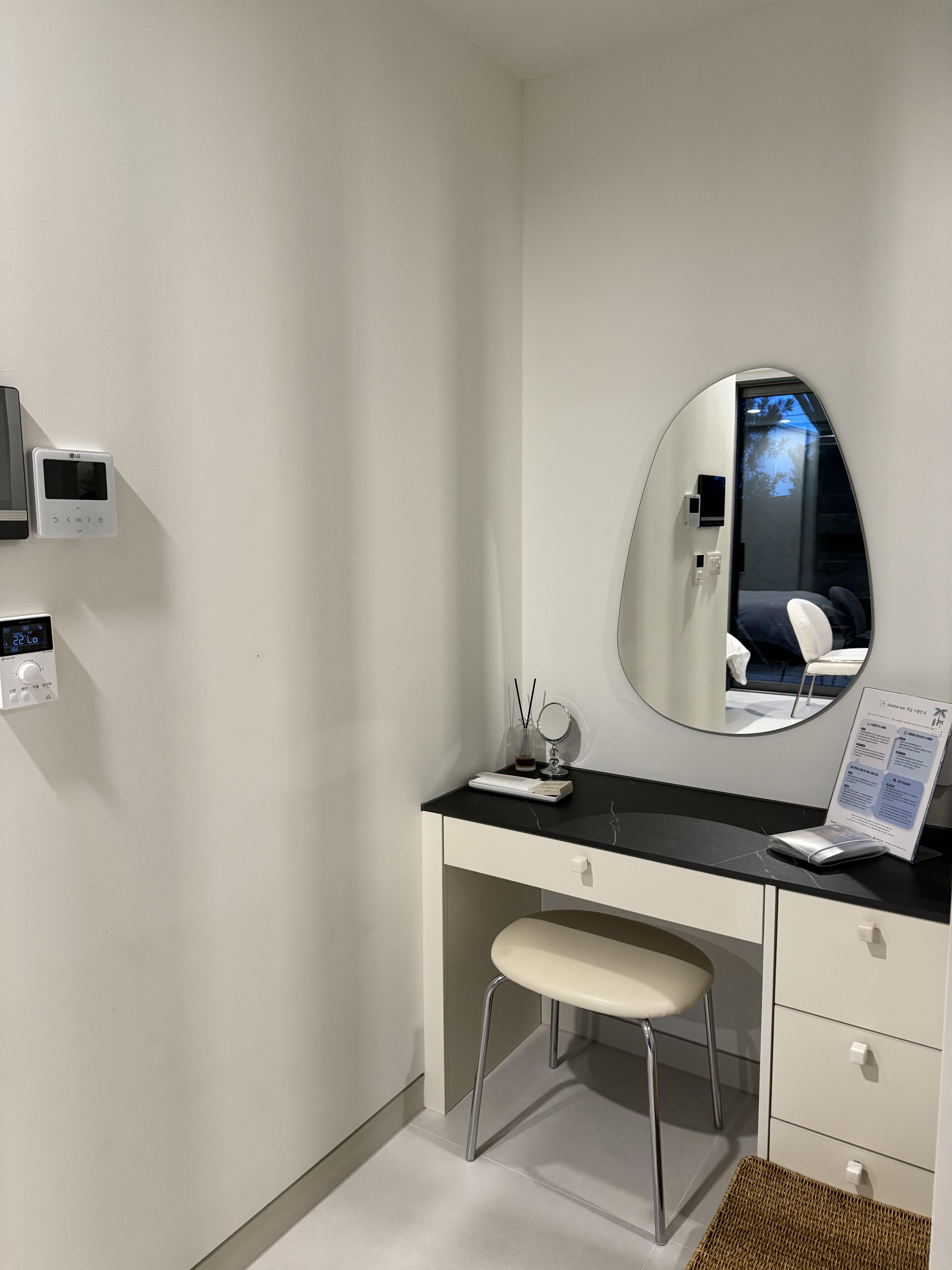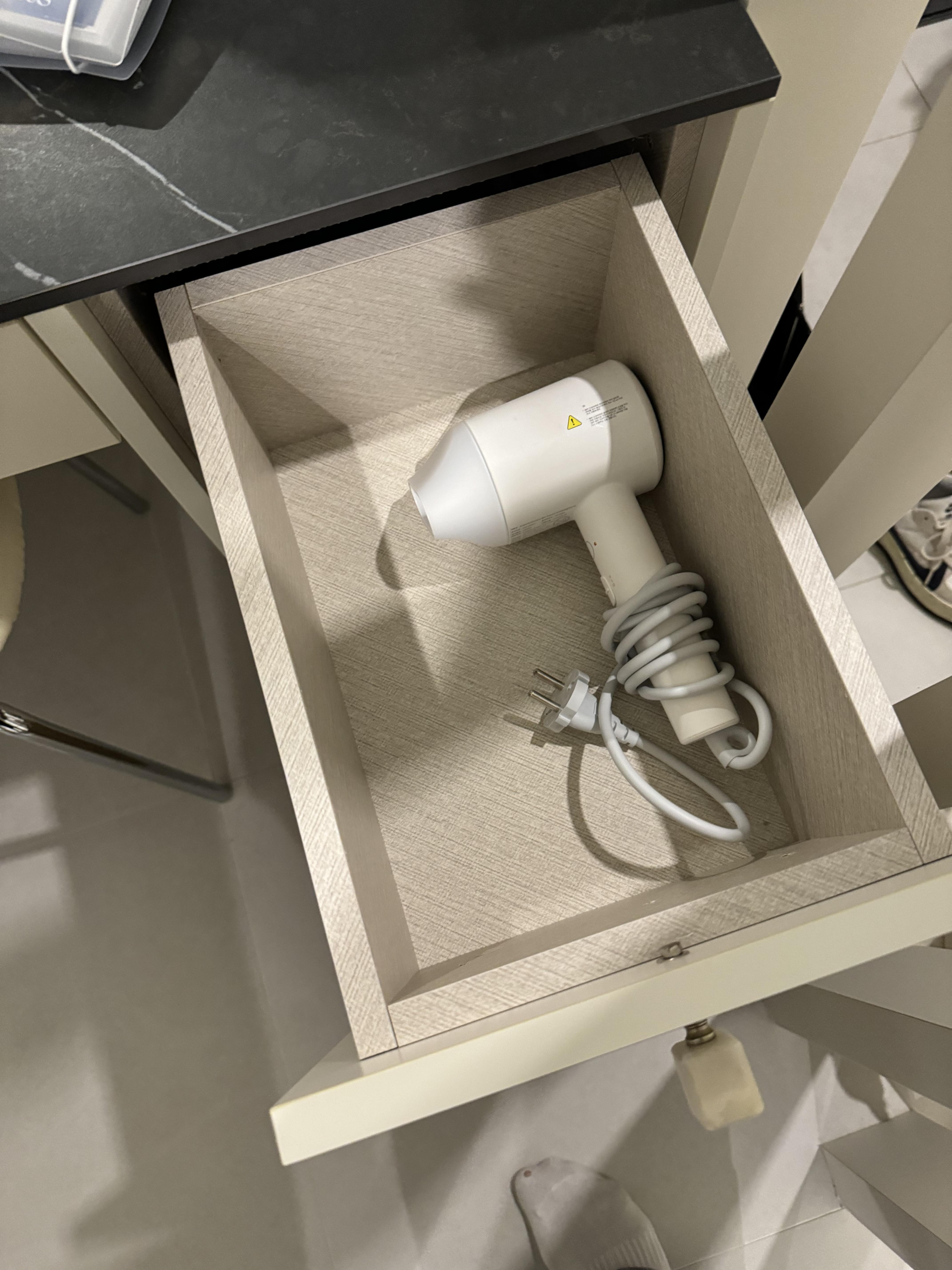 화장대에는 헤어드라이기와 1회 용품들이 있다.