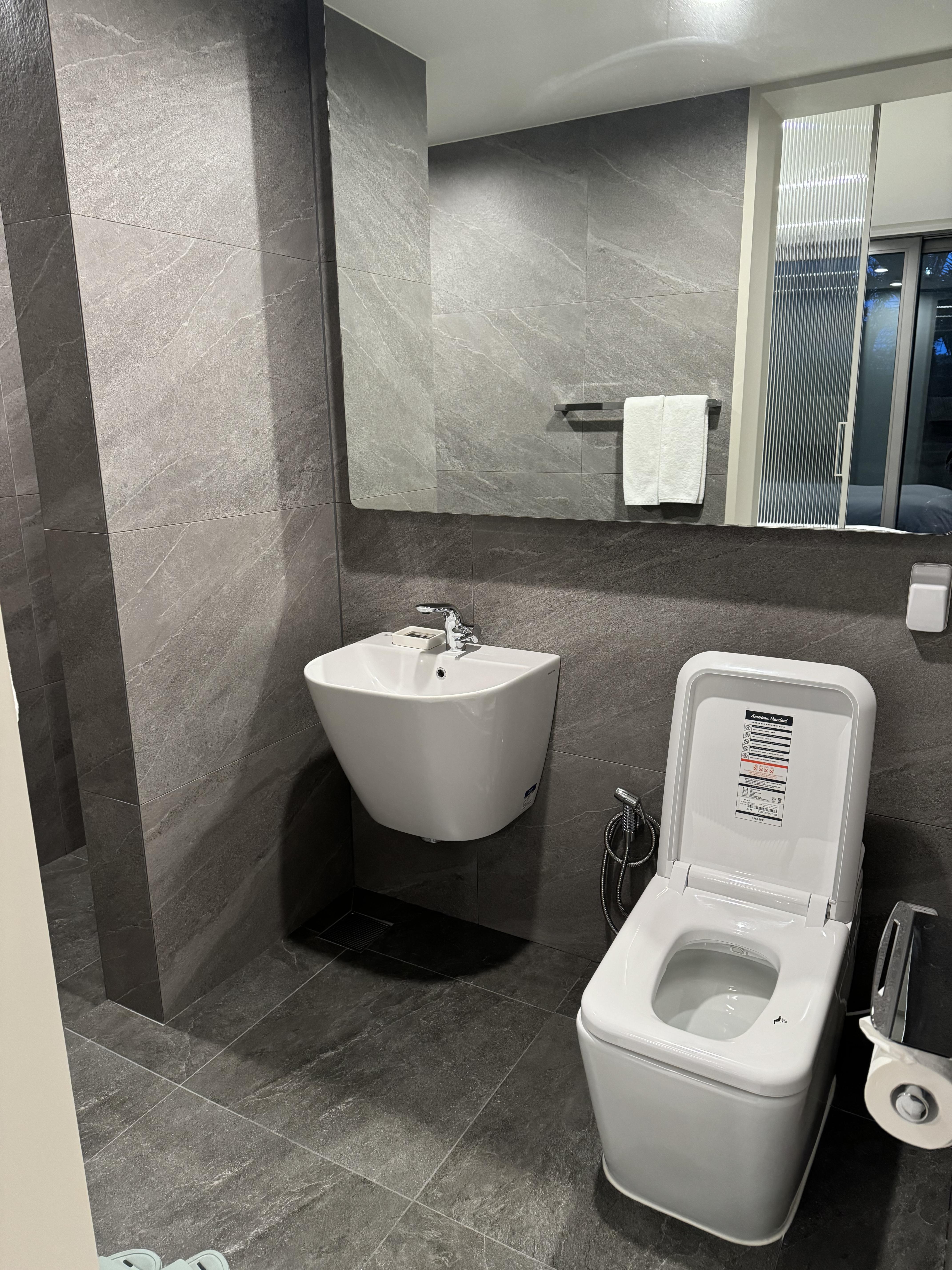 신식 건물의 깔끔함이 돋보이는 화장실이다.