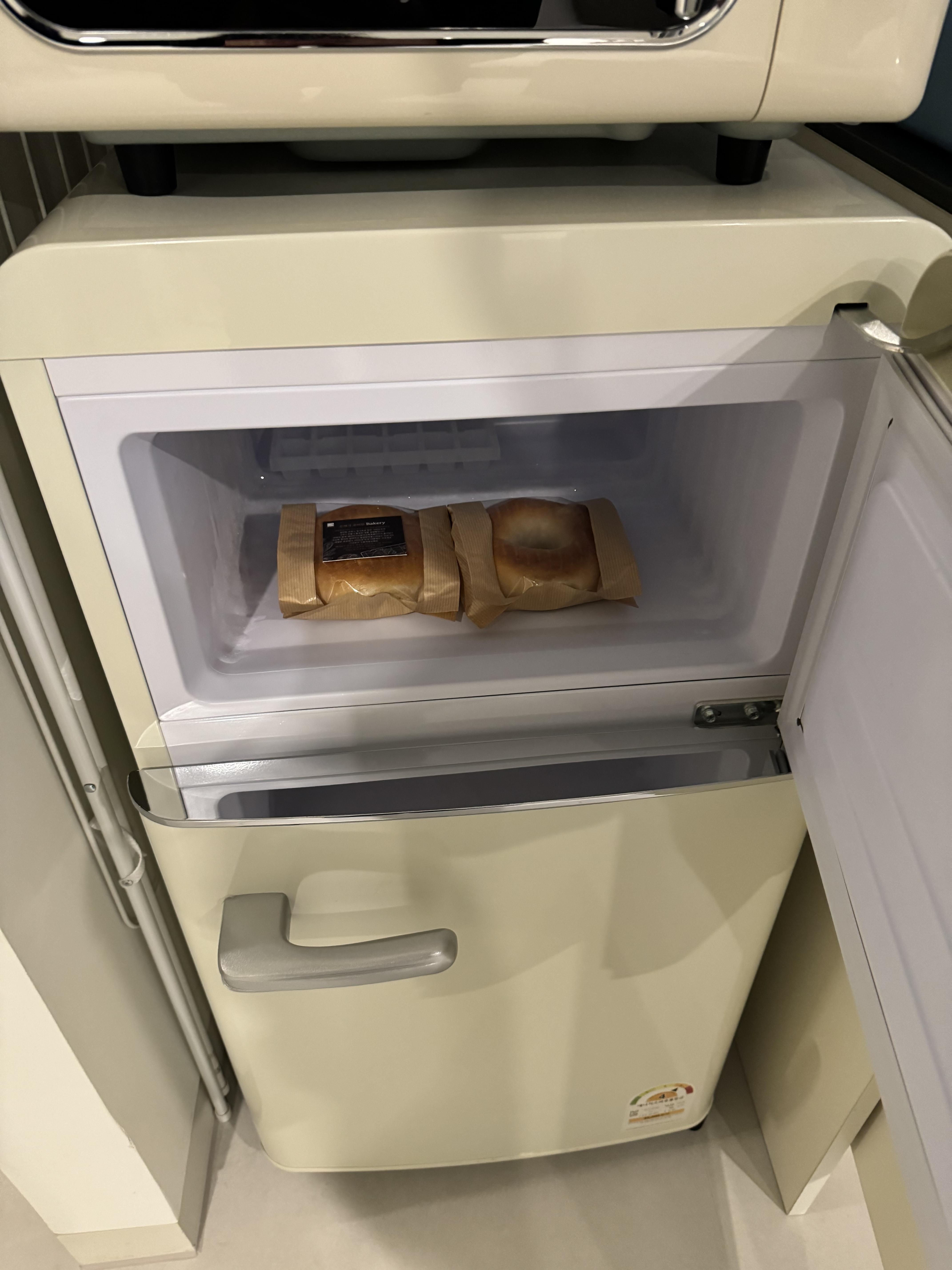냉장고 안에는 사과 주스 2개, 탄산수 2개, 생수 4통, 베이글 2개, 잼, 버터 등 많은 요깃거리들이 있었다.