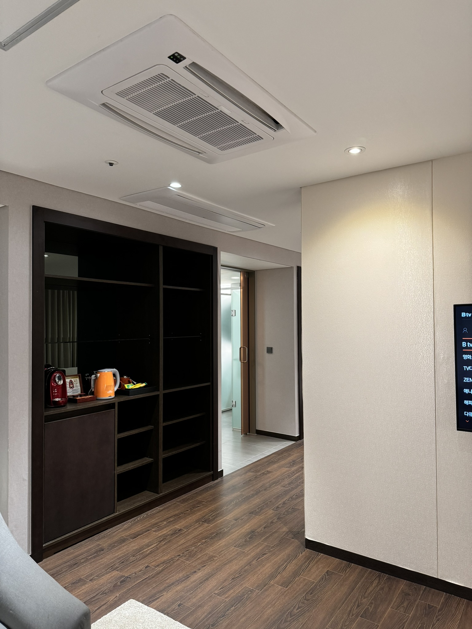 왼쪽에는 겨울겸 옷을 보관할 수 있는 캐비닛이 있다.