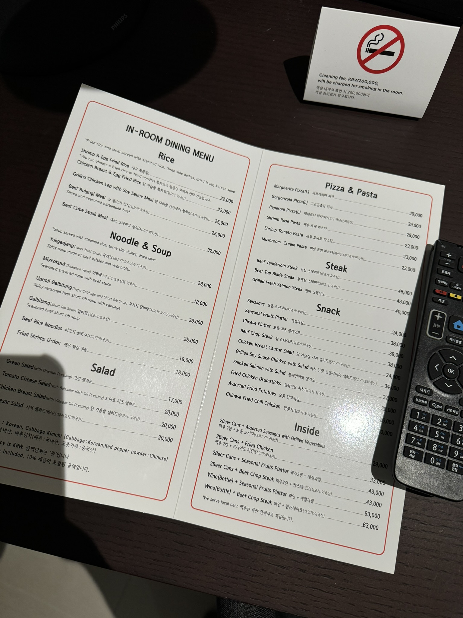 책상 위에 있었던 룸서비스 메뉴들.