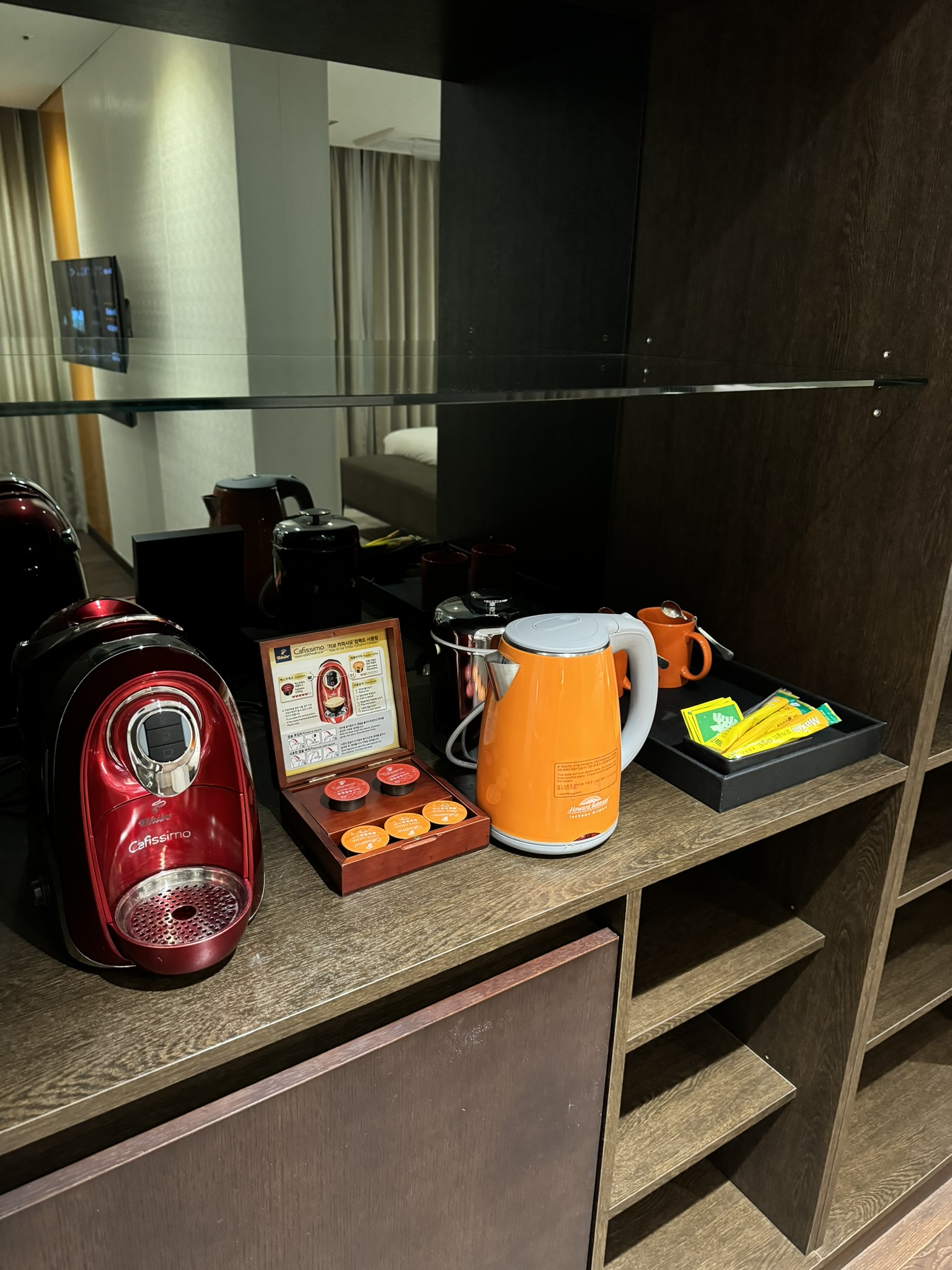 캡슐커피와 간단한 티, 컵, 커피포트가 있다.