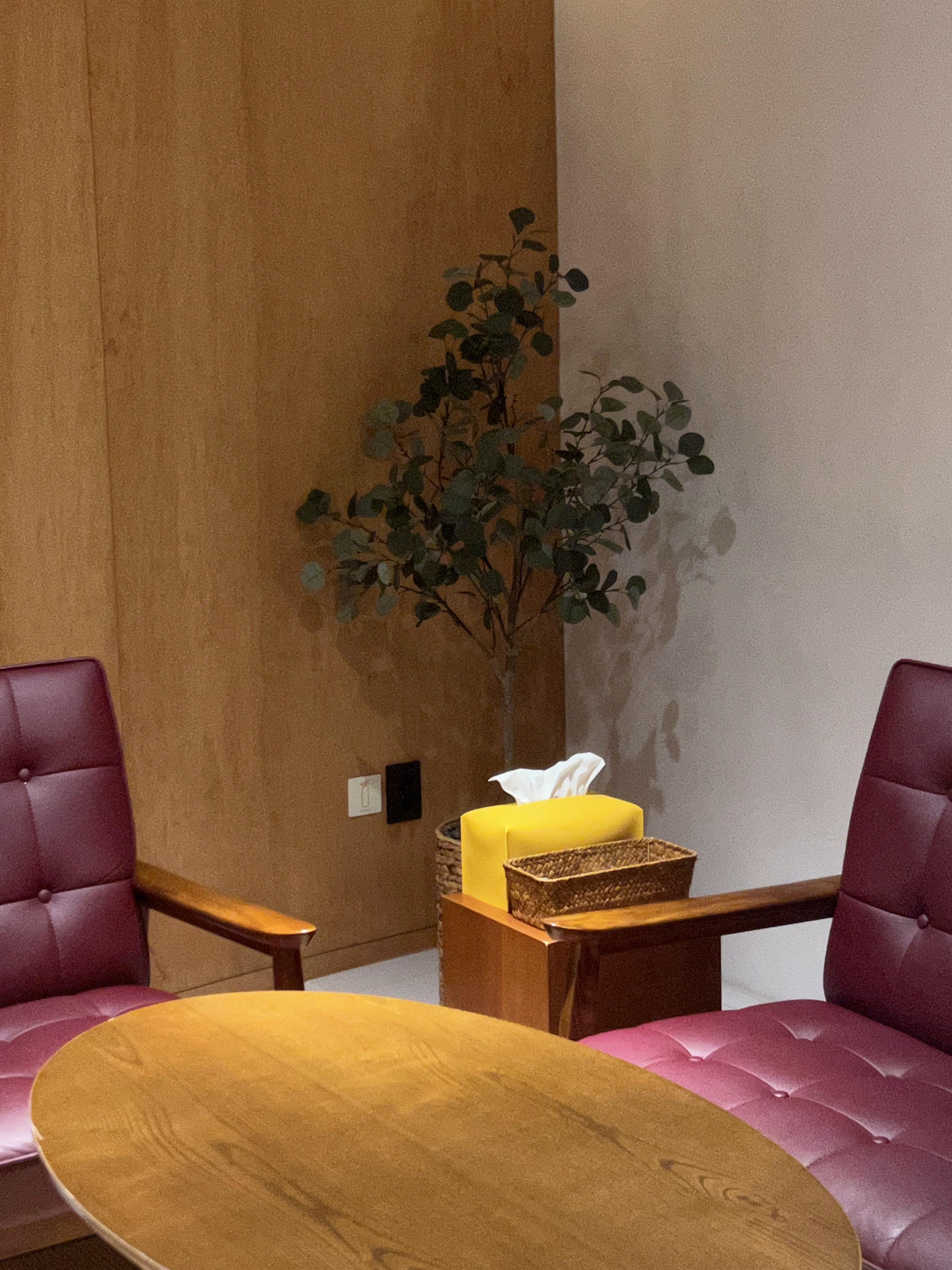 숙소 내에는 조화 화분이 많이 배치되어 있었다. 자줏빛의 의자와 목재 가구가 잘 어울린다.