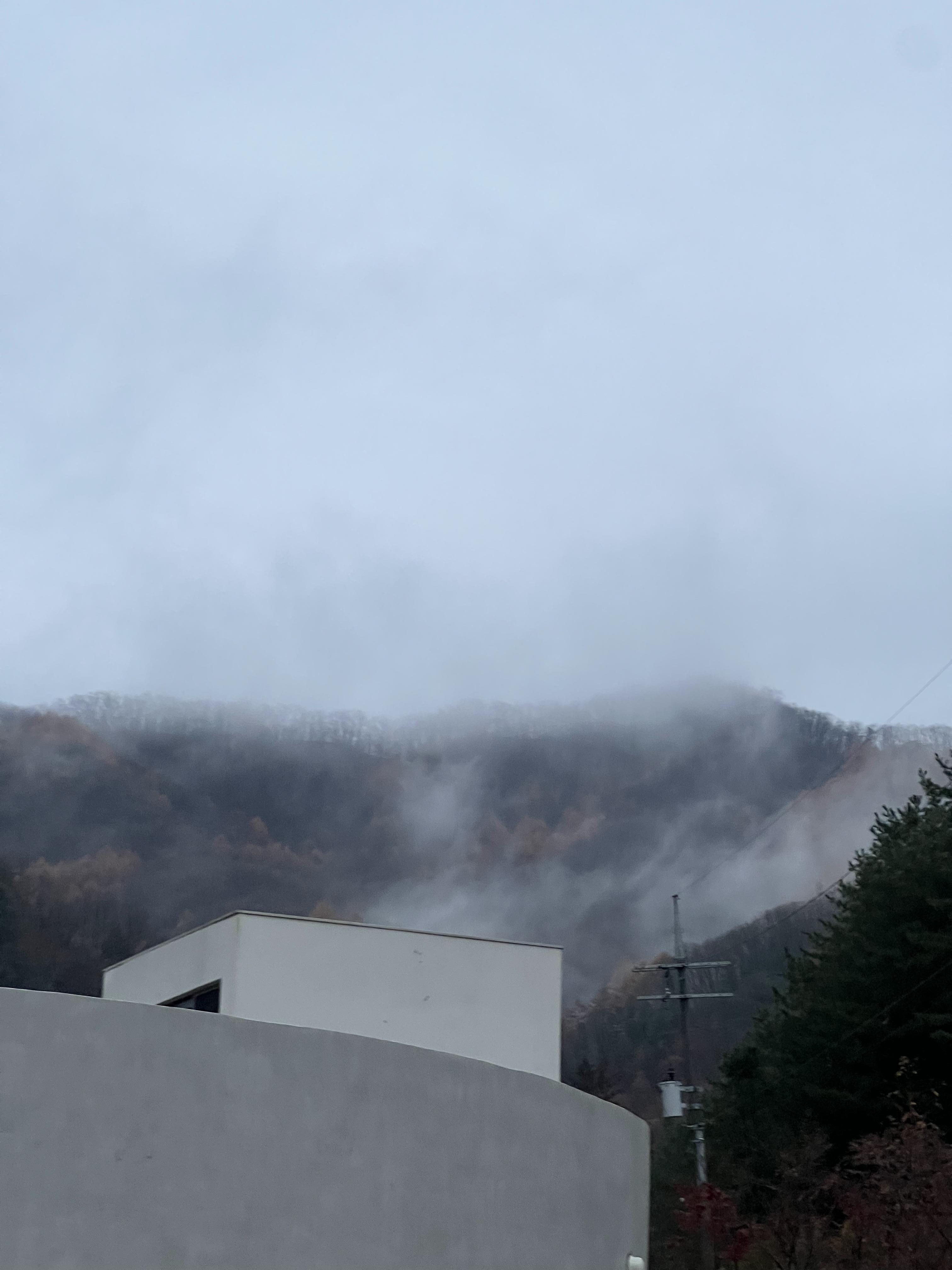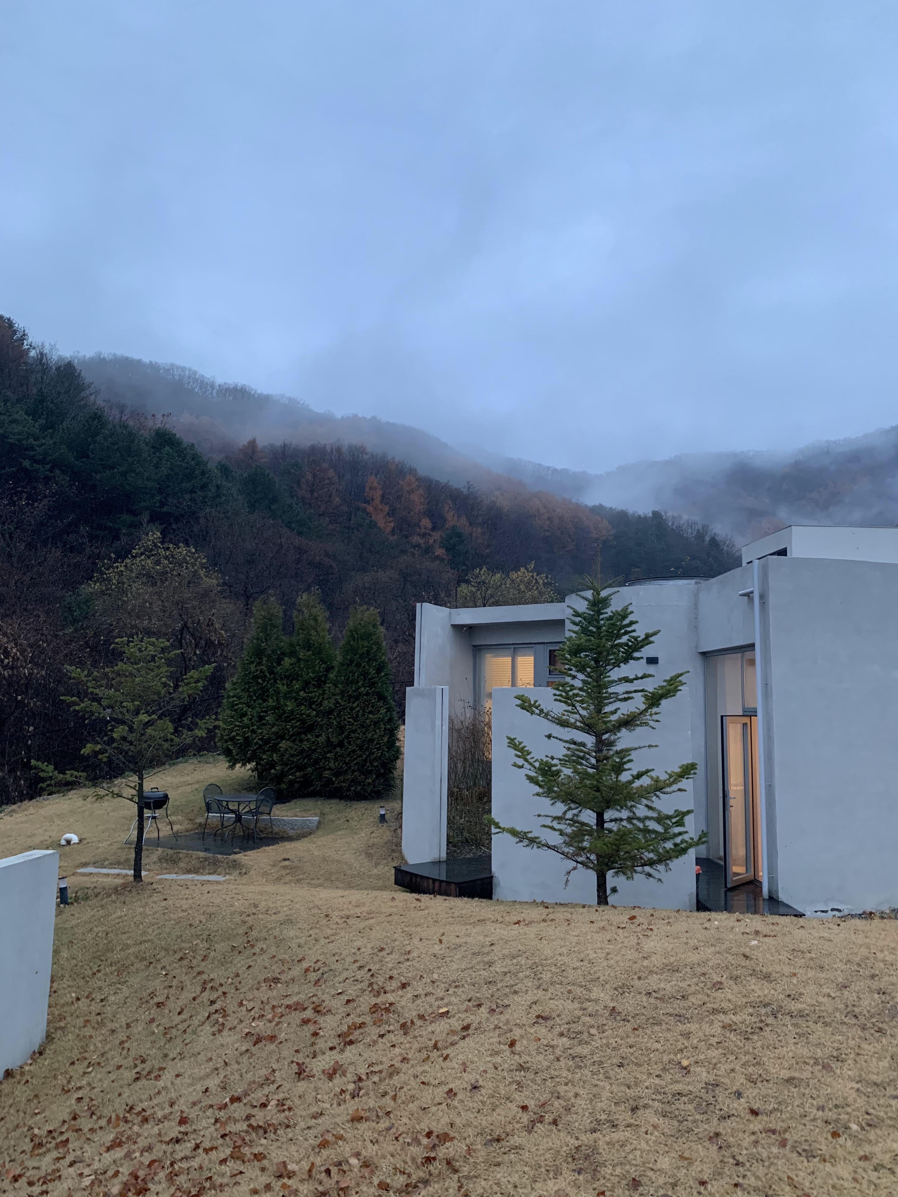 안개가 껴서 더욱 신비로운 분위기가 풍겨졌다. 사진 왼쪽에 바베큐장도 있었지만 음식은 안에서 포장해온걸 먹기로 했다. 여름에는 바베큐장에 벌레가 많다고 하니 벌레퇴치제를 꼭 챙기자! 추가로 야외 자쿠지는 6월부터 9월초까지 운영되어 우리가 갔을때는 사용하지 못했다. 가능한 기간에 자쿠지를 사용하려면 추가금 3만원을 내야된다고 한다.