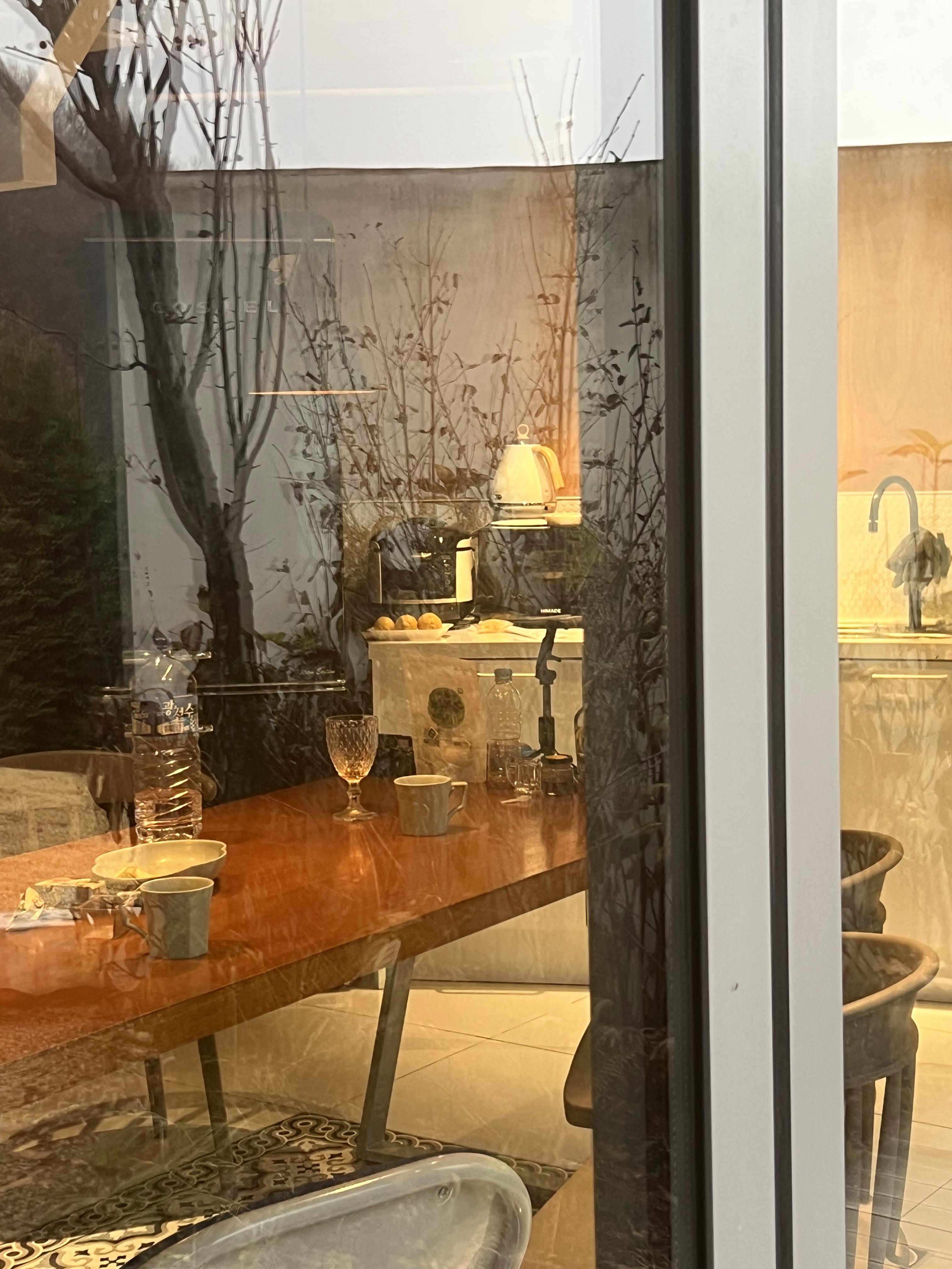 2박동안 내내 먹고 마시며 했던 부엌과 다이닝 테이블. 냉장고도 크고 블루투스 스피커도 사용할 수 있어 매우 편리했다. 뒤에 보이는 계단을 통해 복층으로 올라갈 수 있다. 복층에는 침대 1개가 있으며 높이도 낮지 않아 불편하지 않았다. 계단 바로 앞에는 화장실이 있다.
