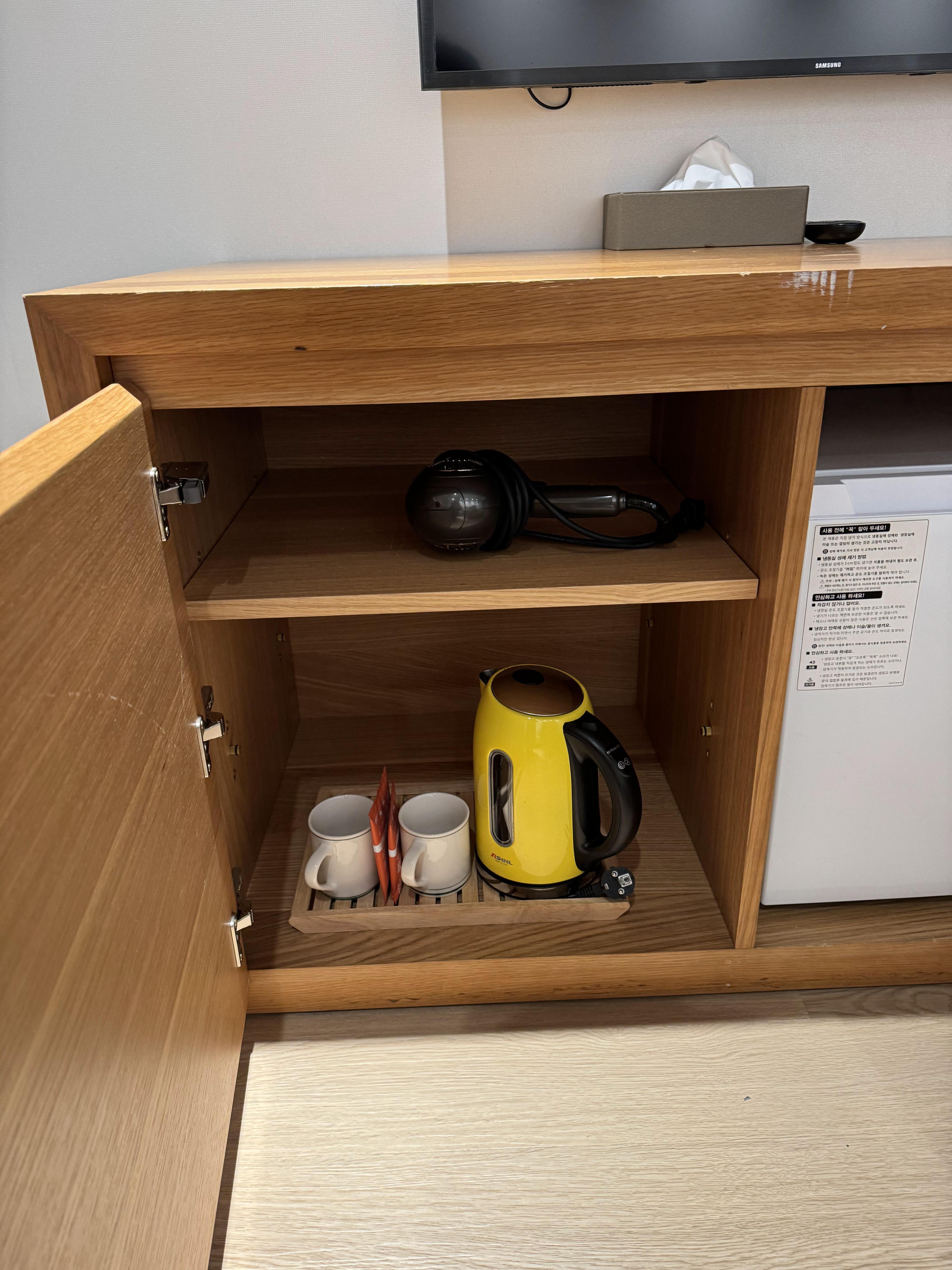 헤어드라이기와 커피 포트, 컵 등이 보인다.